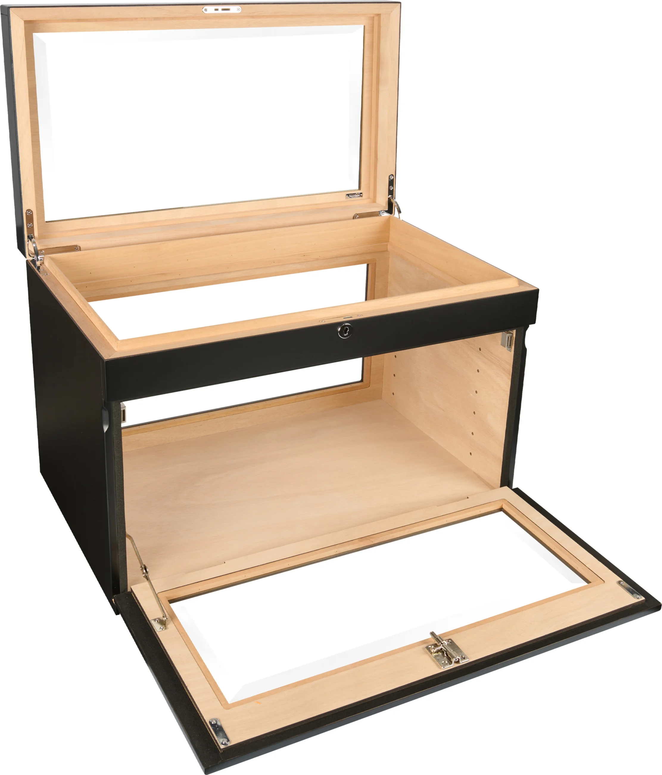 - Optional trays for individual cigars and boxes can be inserted and optionally angled for optimal presentation.