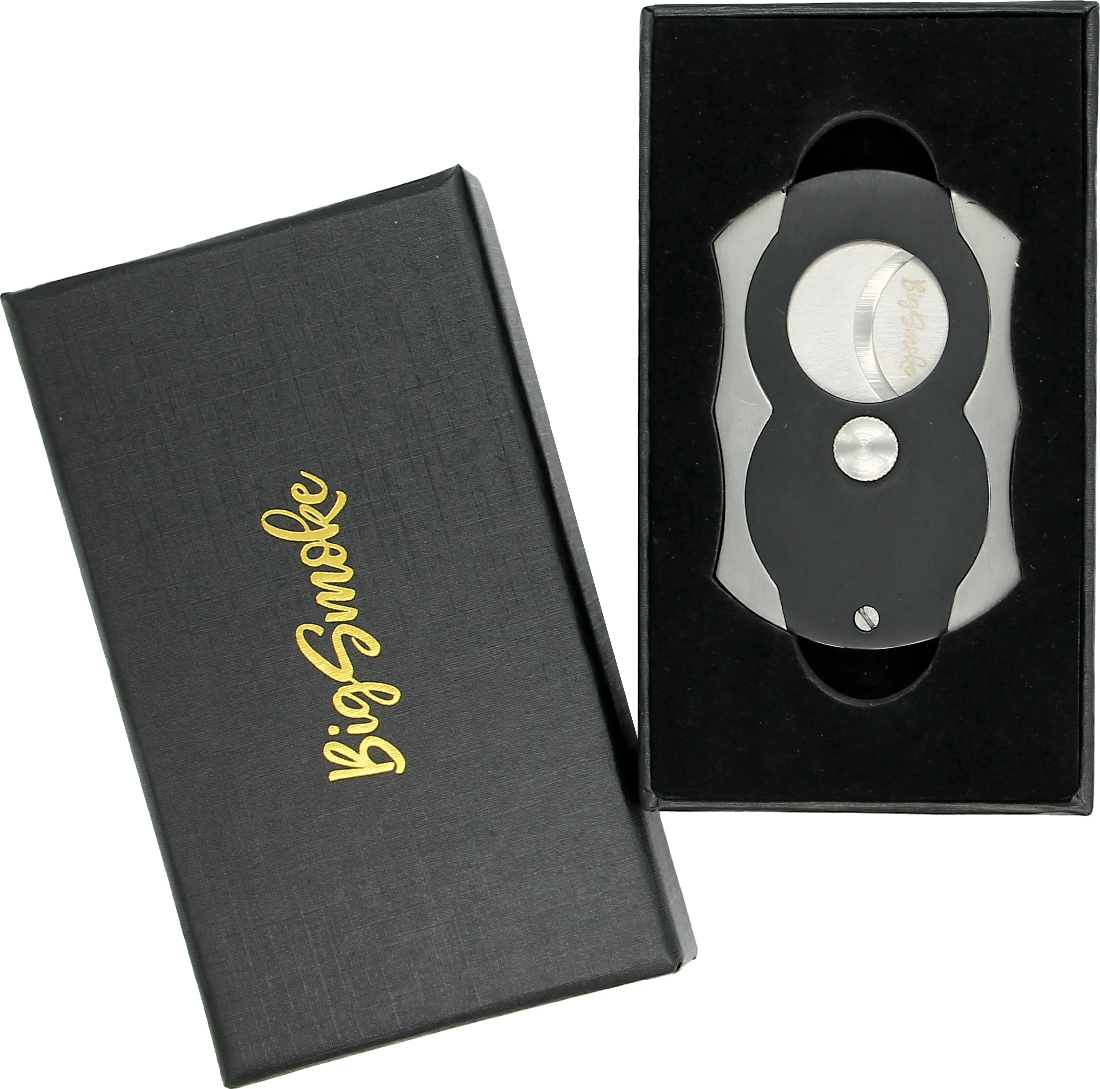 - Cortador de charutos de lâmina dupla da marca BigSmoke em preto e prata