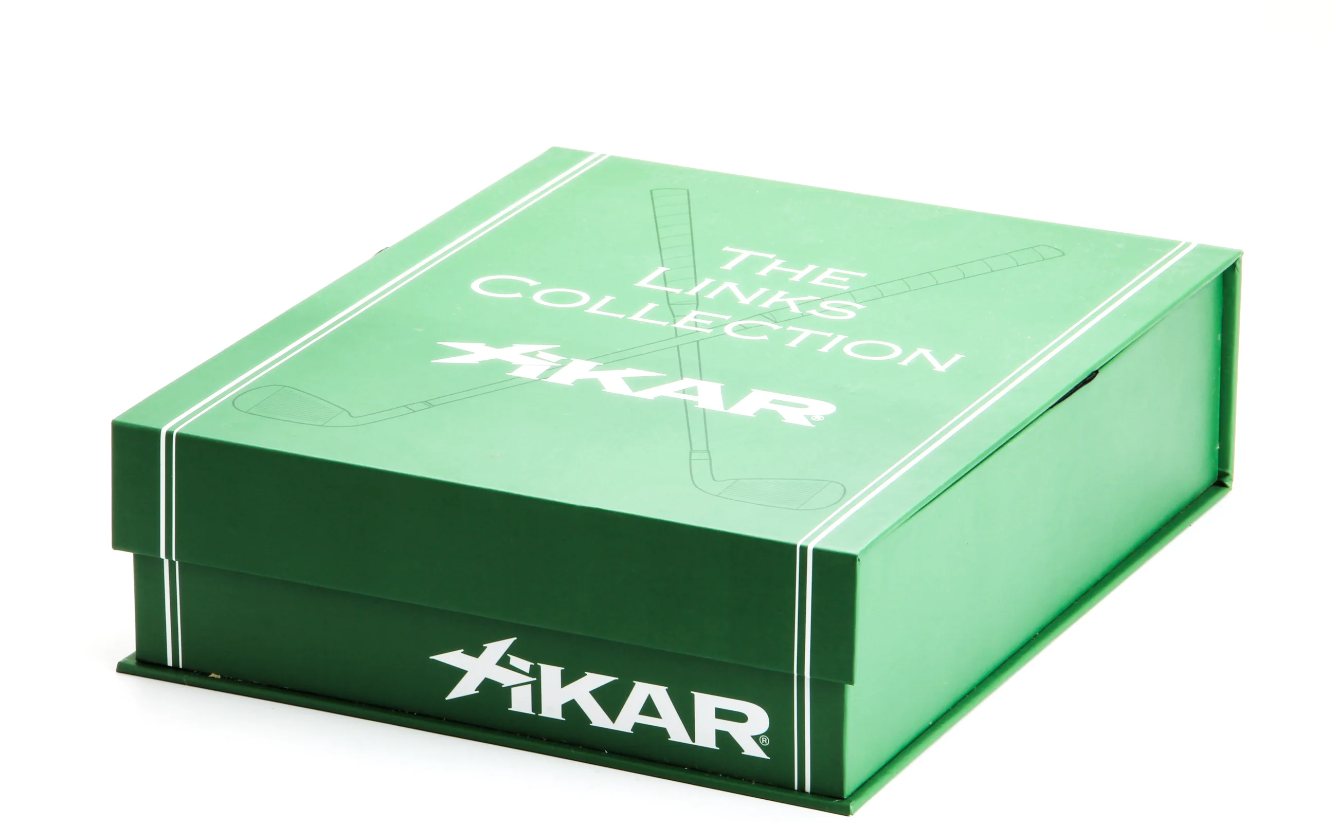 Envoltos em lindos verde e branco, esses acessórios são tudo o que o entusiasta de charutos precisa para relaxar após um dia passado no golfe. O lendário cortador Xi da Xikar e suas poderosas lâminas de aço inoxidável oferecem o corte perfeito com apenas um simples aperto das alças. O premiado isqueiro Forte jet da Xikar com uma incrustação decorativa moldada a partir de uma face de taco de ferro oferece uma chama forte e resistente ao vento, ideal para o campo. Um cinzeiro de cerâmica "hole in one" apresenta uma tigela funda "sand trap" com descansos para quatro charutos e uma xícara estilizada, o que o torna um suporte de acessórios perfeito.