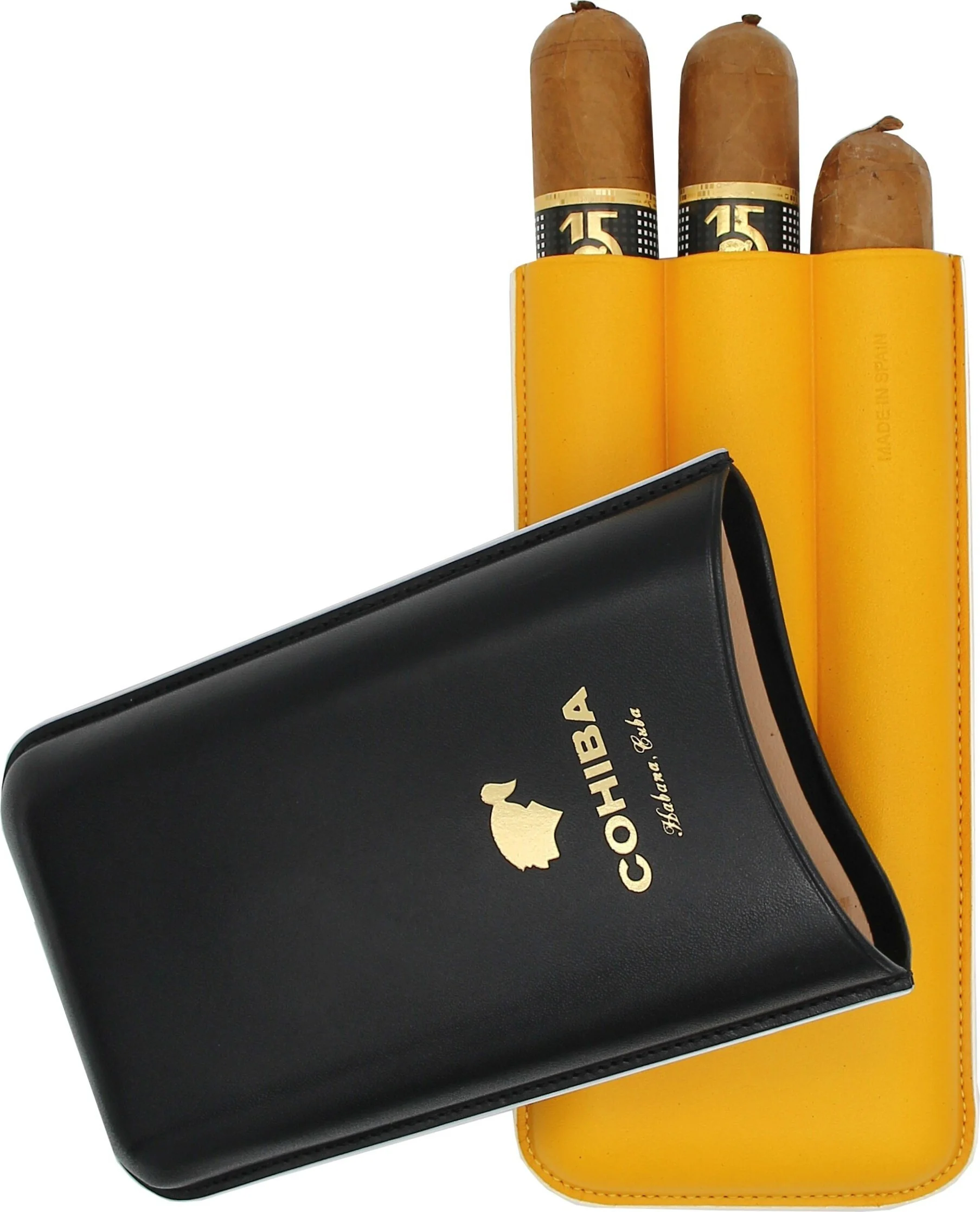 Estojo para charutos Cohiba em couro preto, amarelo e branco.