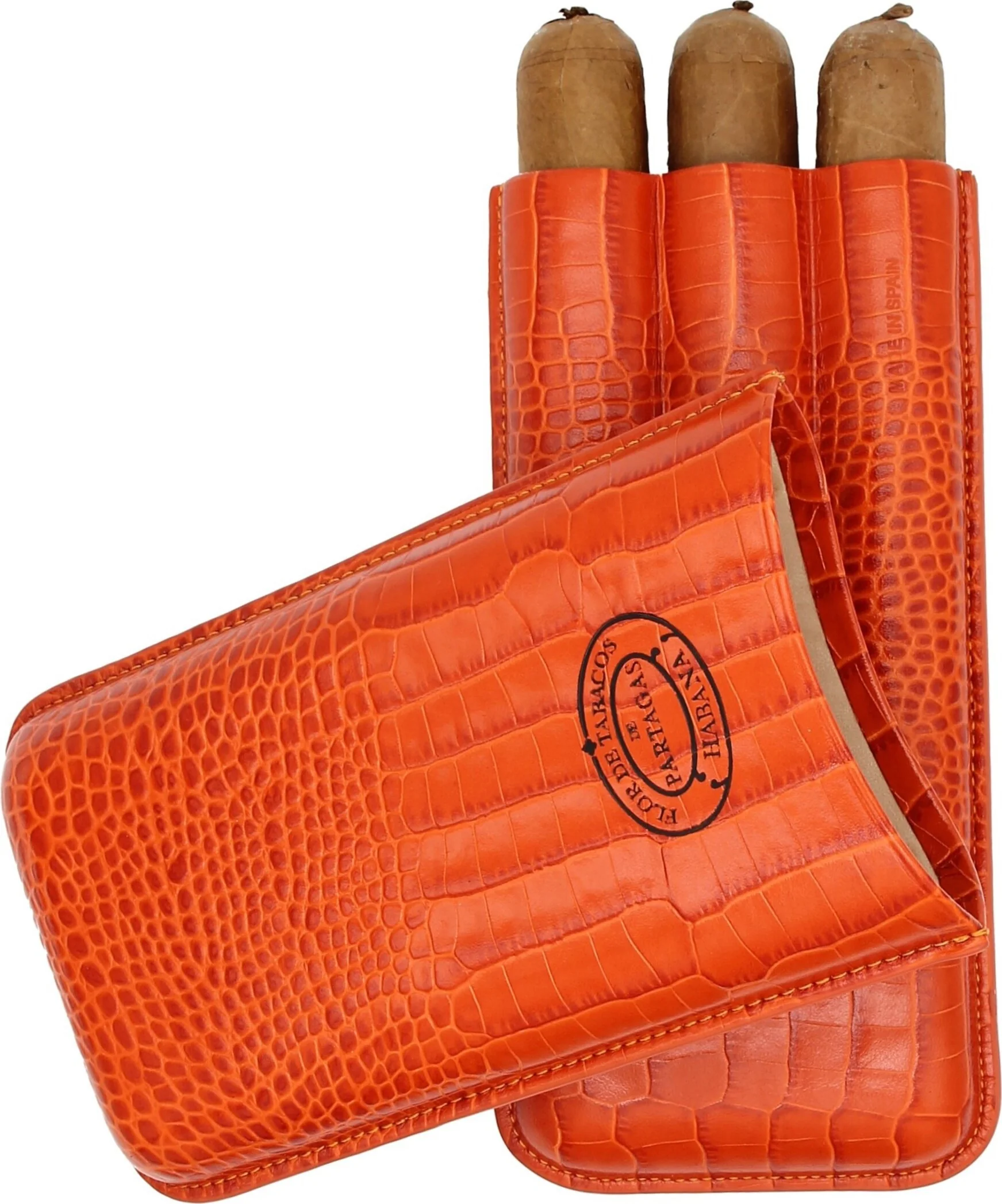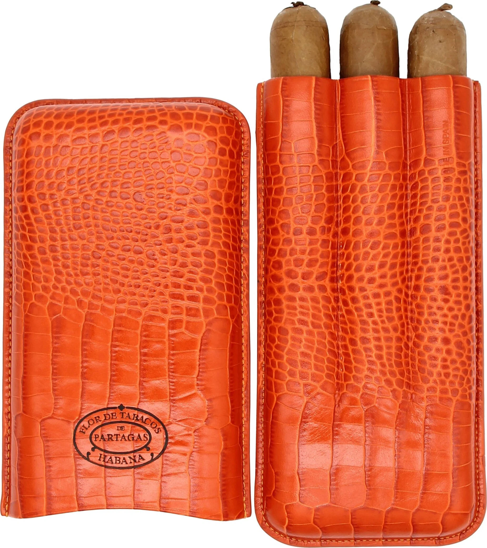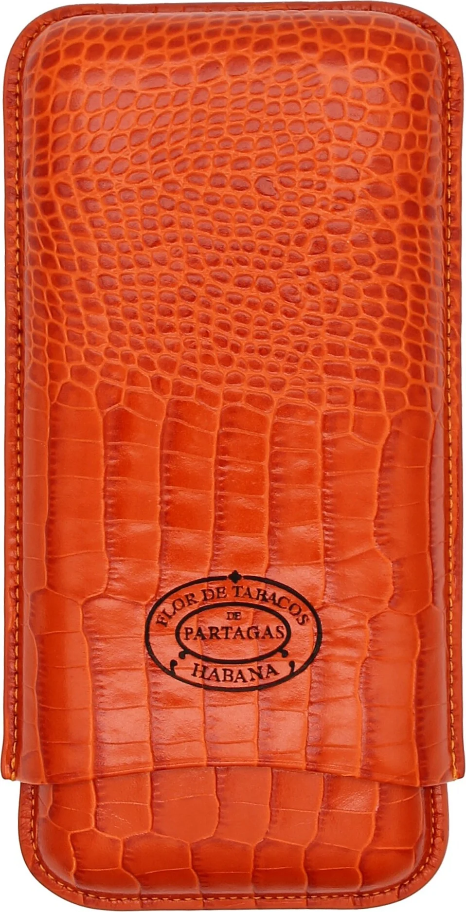 The Partagas Classic cigar case made of genuine leather in a striking orange is a luxurious accessory from the Cuban cigar brand Partagas. The finely embossed leather surface with a crocodile-like texture conveys an authentic look. The brand logo, unmistakably representing the Partagas brand, is prominently displayed on the front, giving the case an exclusive appearance.