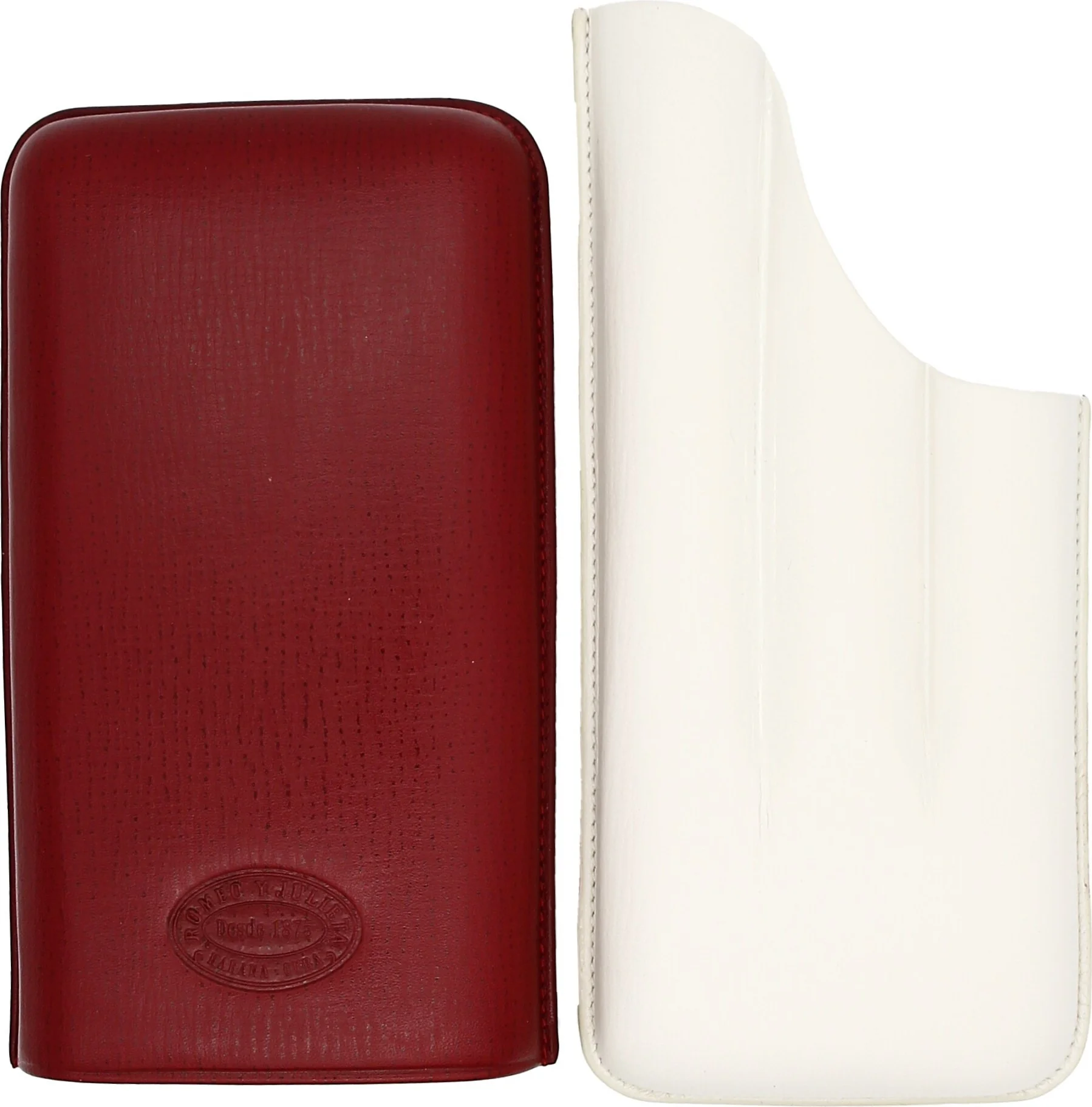 The Romeo y Julieta cigar case in elegant dark red with gray and white accents is a high-quality accessory from the long-established Cuban cigar brand. The finely textured embossing on the top and bottom gives the case an exclusive feel, while the embossed Romeo y Julieta logo on the front underscores its elegant brand identity.