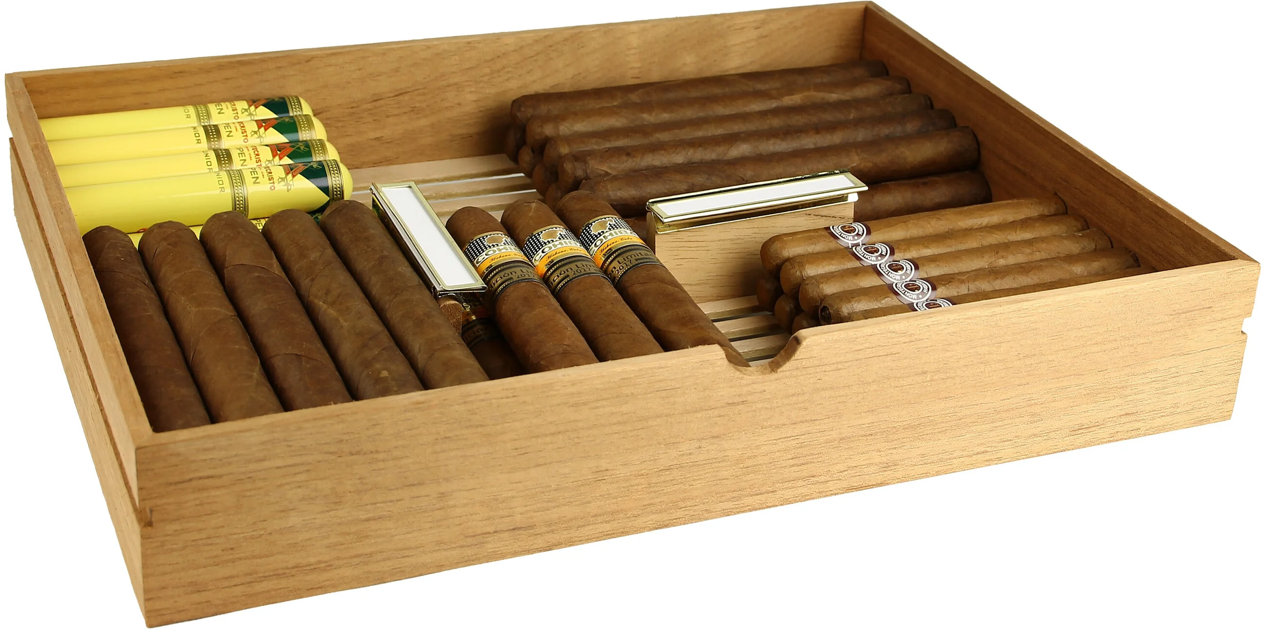 - Design prático: Com dimensões de 38,5 x 28,5 x 6,2 cm, a gaveta oferece amplo espaço para um número considerável de charutos. Um recorte para o trilho guia da gaveta de 7 mm garante um movimento suave.