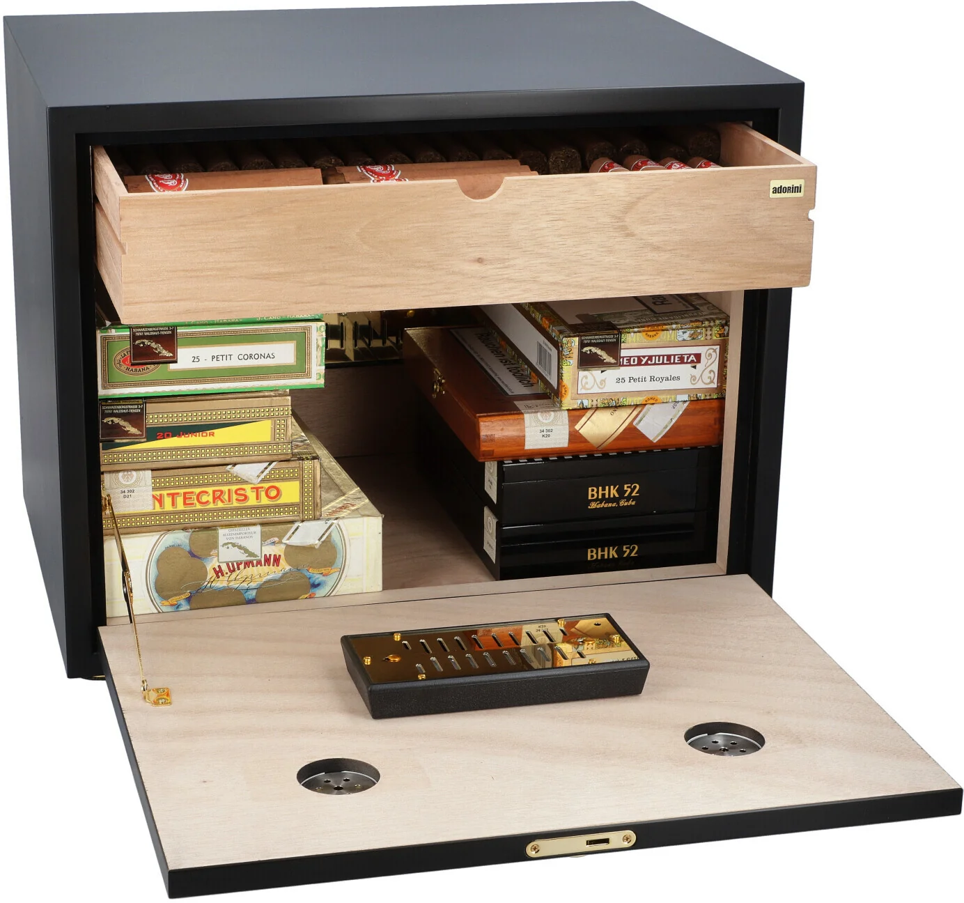 A gaveta para o Humidor adorini Habana Deluxe não só oferece espaço de armazenamento adicional, mas também fornece uma maneira prática de manter seus charutos seguros e organizados.