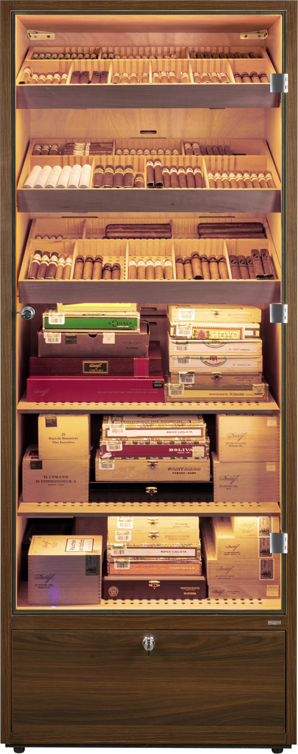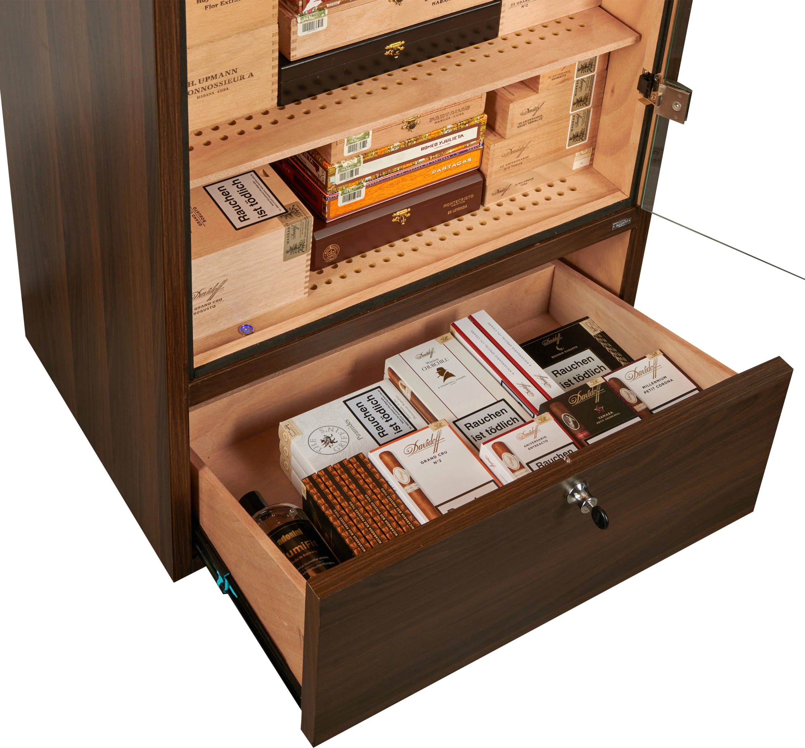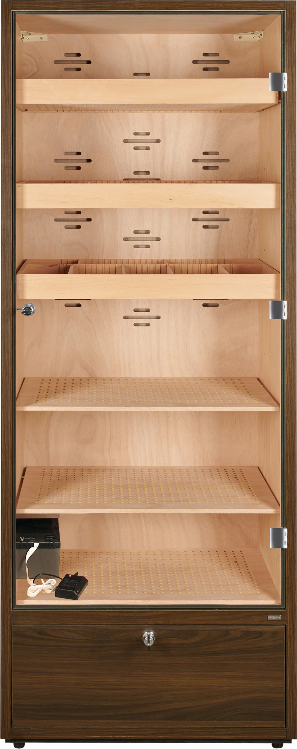 The base of the humidor cabinet contains a lockable drawer that can be used for storing cigars as well as accessories or consumables such as distilled water. The drawer bottom is perforated and separated from the interior, allowing humidity to circulate and ensuring safe cigar storage.