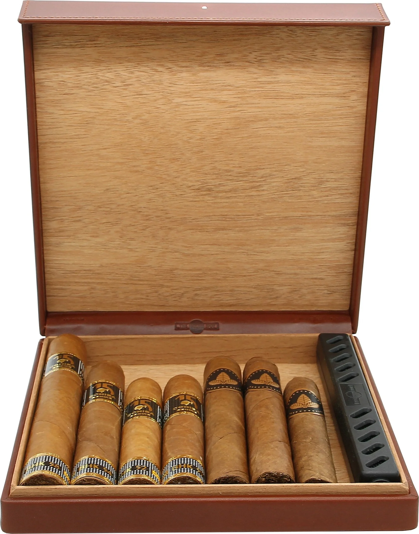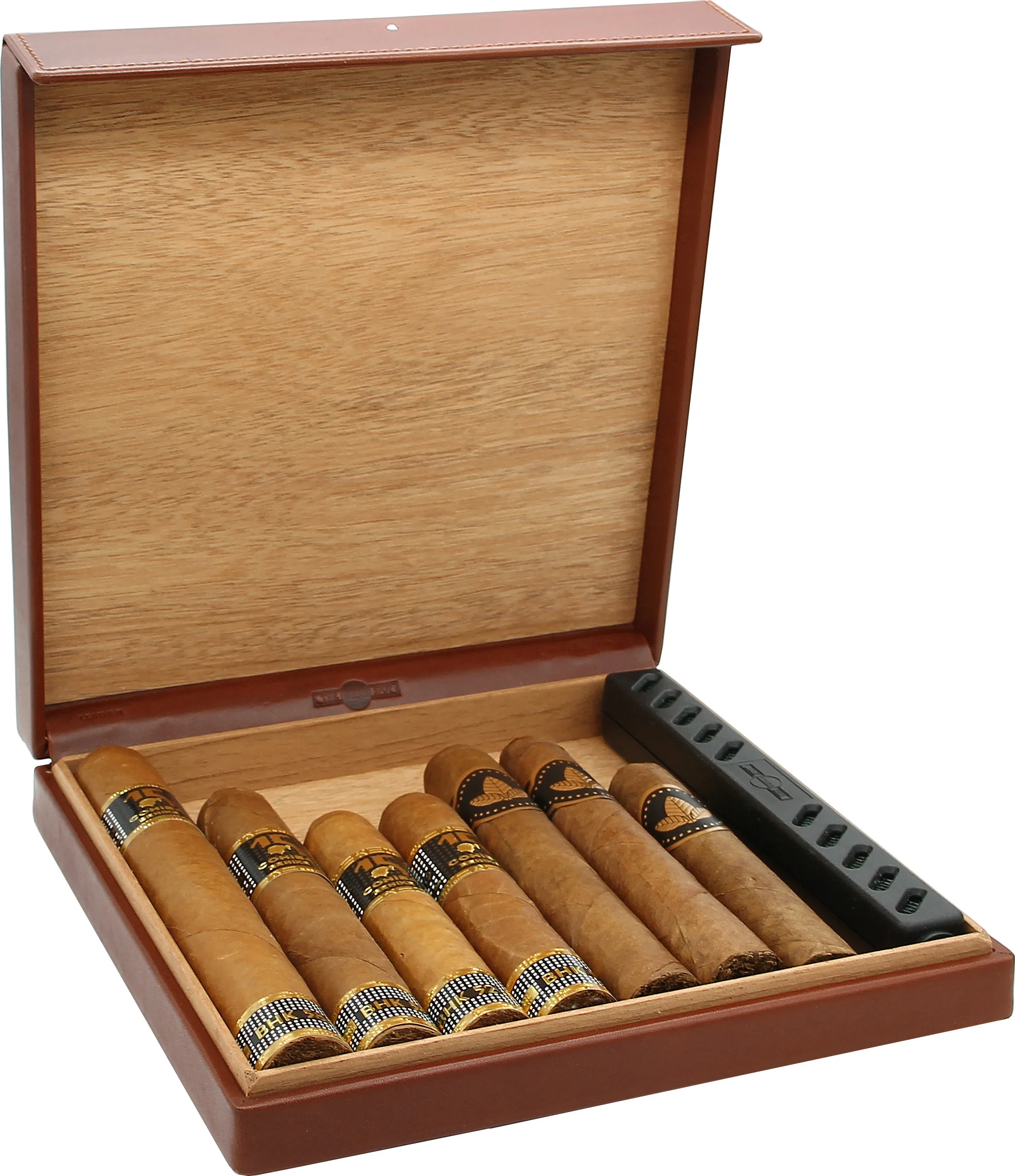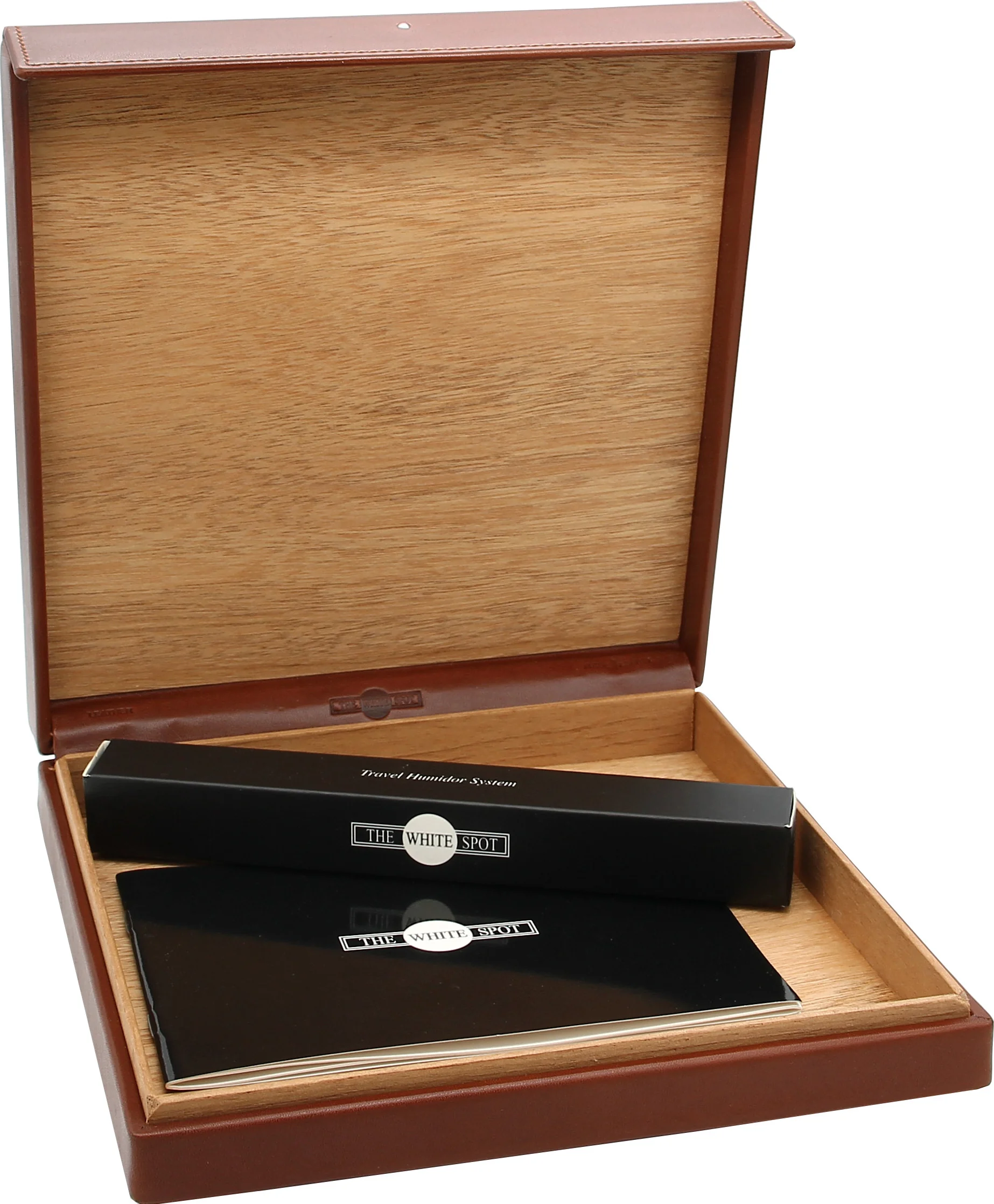 This elegant brown travel humidor from the renowned English brand Dunhill is the perfect companion for travelling. Covered in the finest Spanish leather and lined with high-quality wood, it offers space and protection for approximately 10 cigars. The closure is a magnetic clasp hidden beneath the leather. The bulldog logo embossed into the leather is an unmistakable Dunhill trademark, as is the famous White Spot on the front of the humidor. A sophisticated travel humidor that stylishly protects your cigars and proves to be a reliable companion on all your travels and trips.