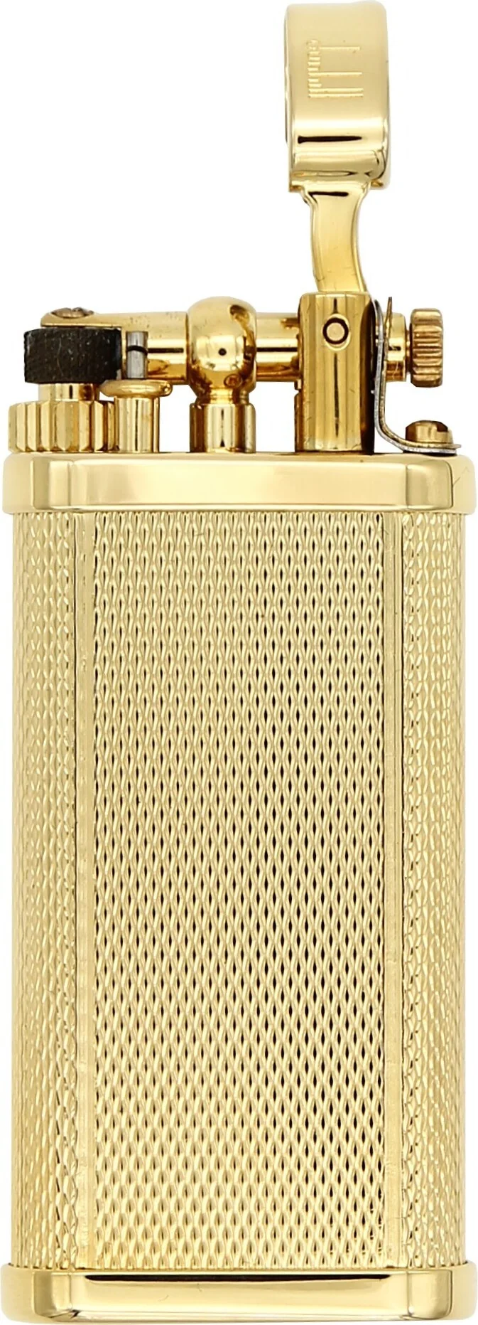The ignition mechanism is concealed by a protective cover with a fine Dunhill brand engraving. Opening the lid exposes the friction wheel ignition, and turning the wheel toward the operator reliably ignites the flame.