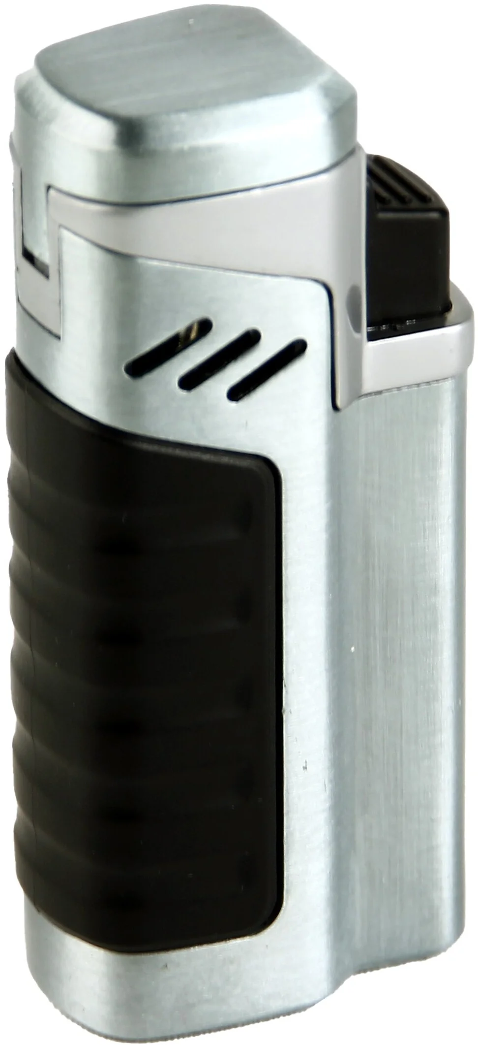 - Design cromado elegante: O isqueiro apresenta um corpo cromado elegante com elementos de empunhadura pretos, combinando estética com funcionalidade.