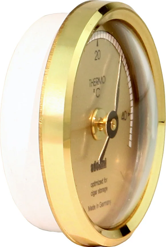 O termômetro dourado da Adorini combina funcionalidade e design elegante em um formato compacto. Ideal para quem deseja combinar confiabilidade e estilo em seu umidor.