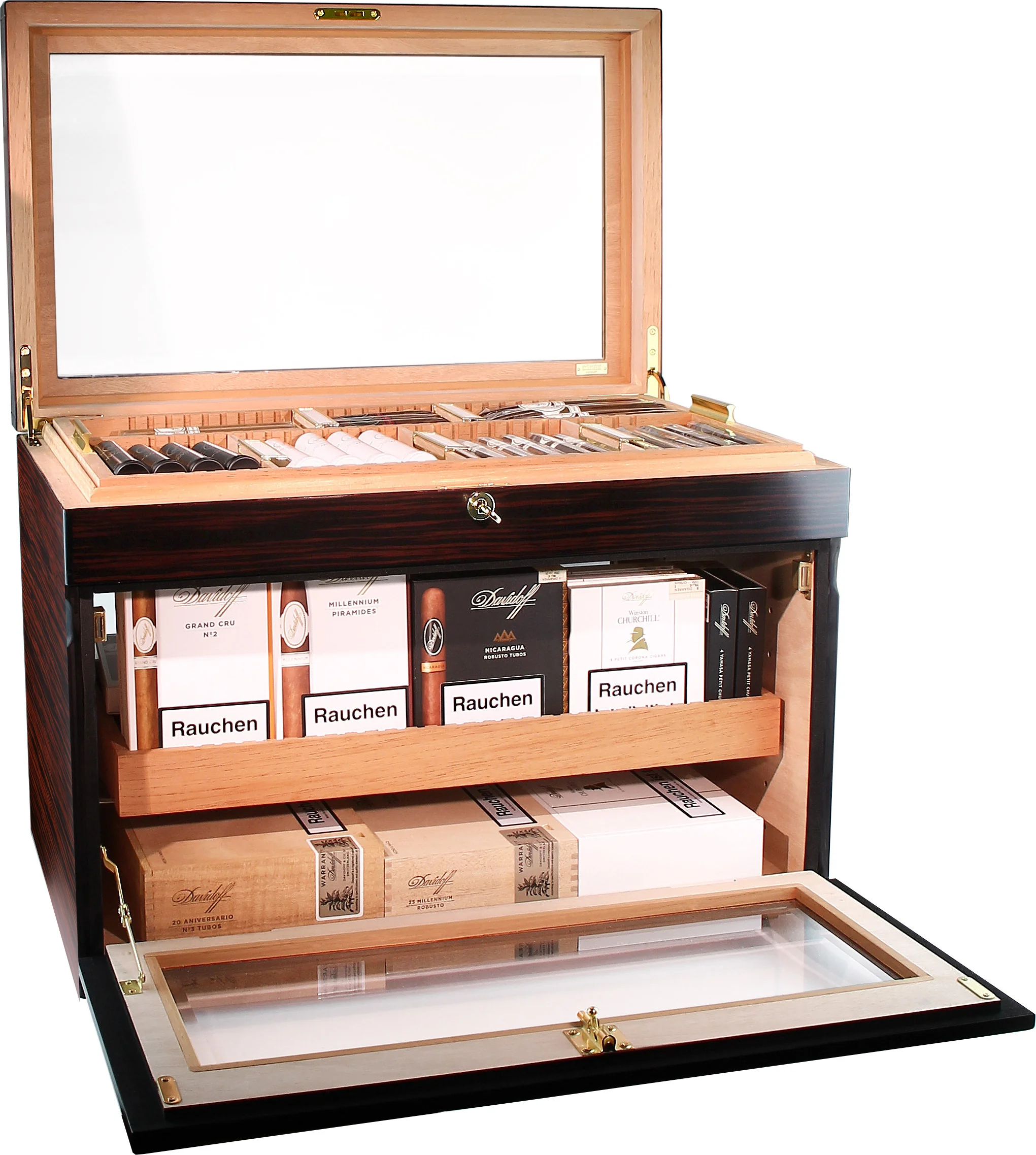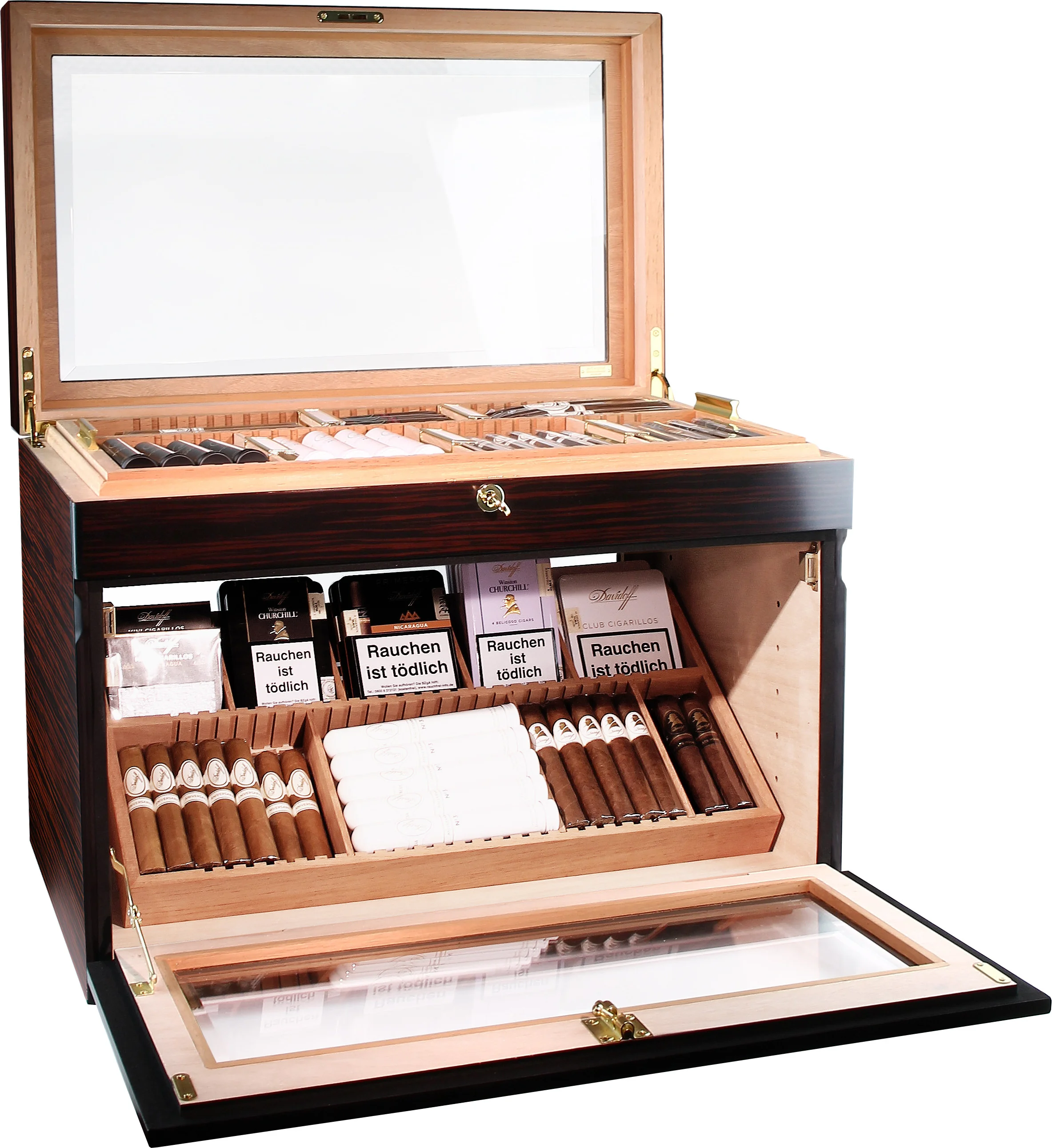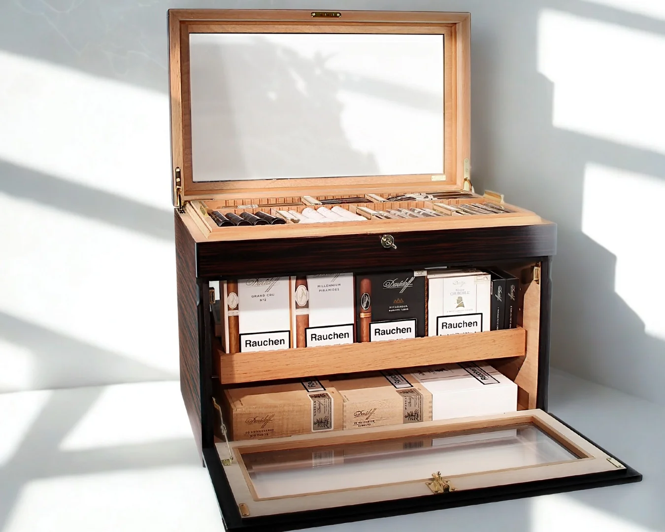 Individual cigars, boxes, or even entire cigar crates can be stored on multiple levels. The interior can be divided into various compartments: