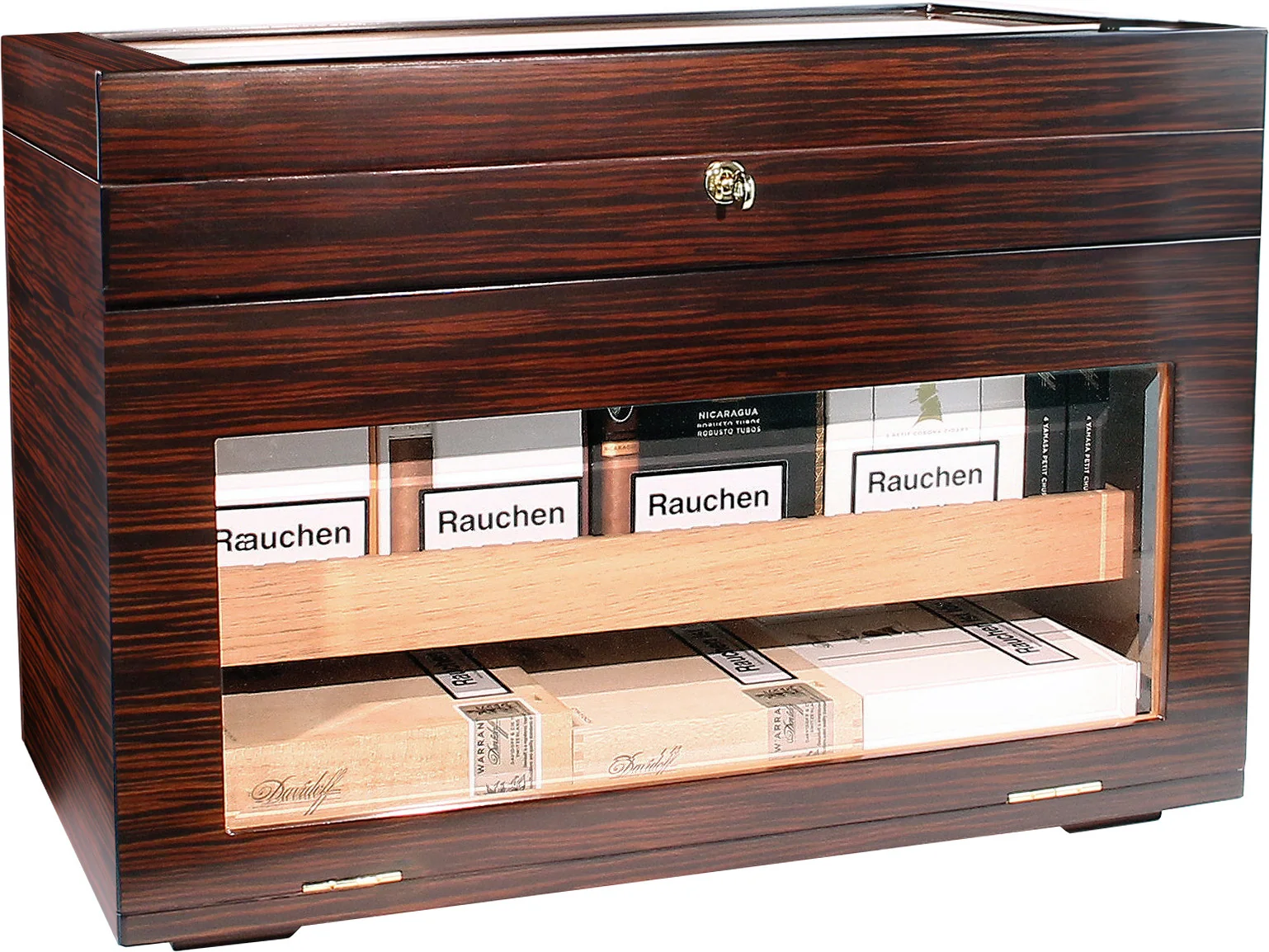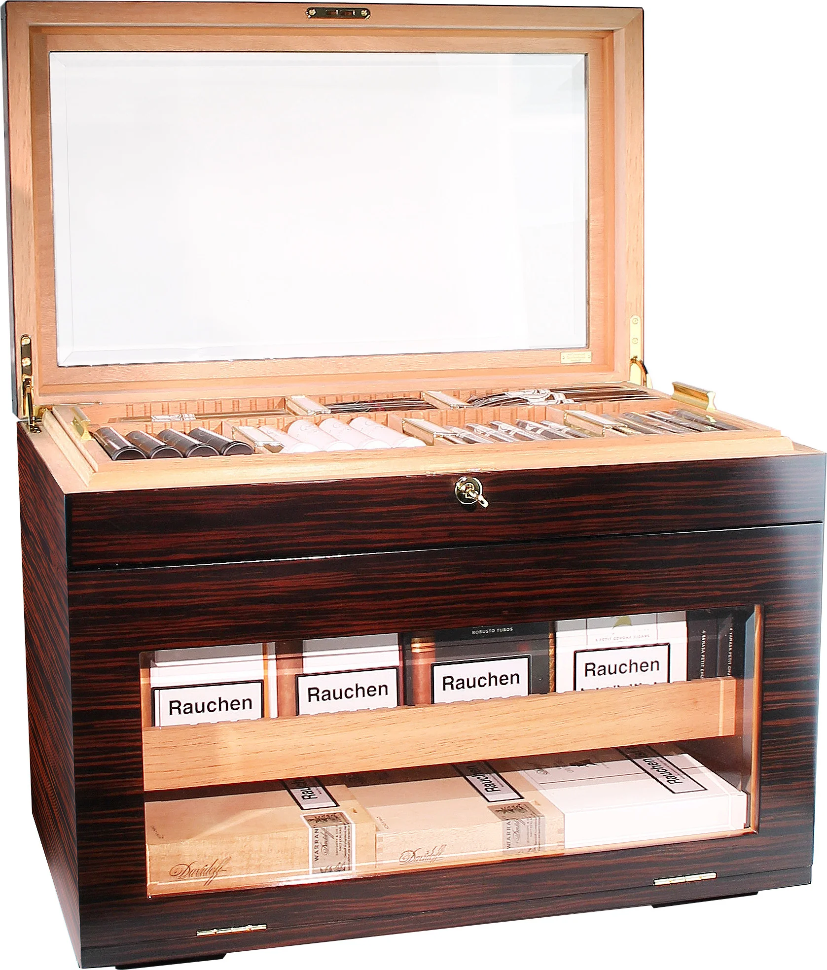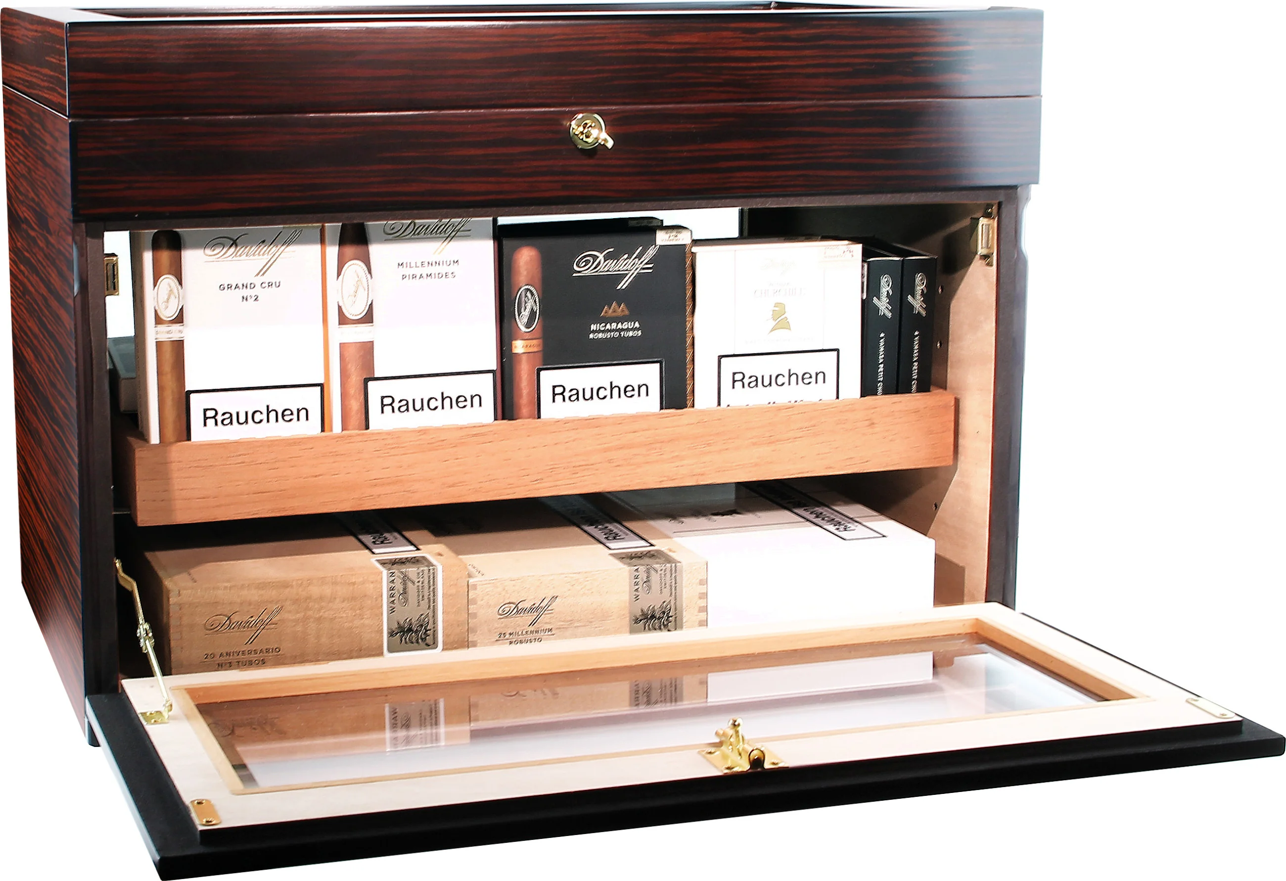 Individual cigars, boxes, or even entire cigar crates can be stored on multiple levels. The interior can be divided into various compartments: