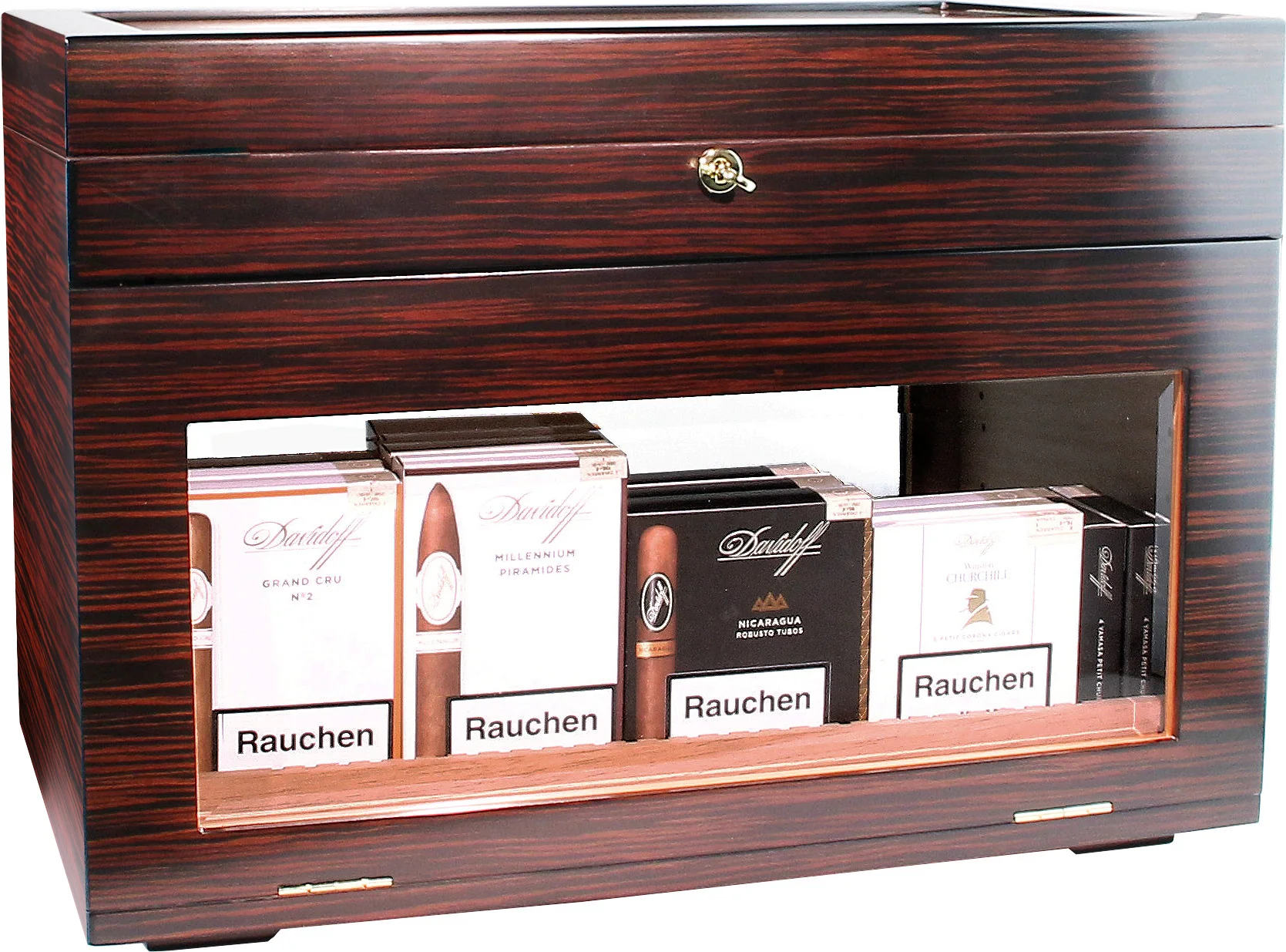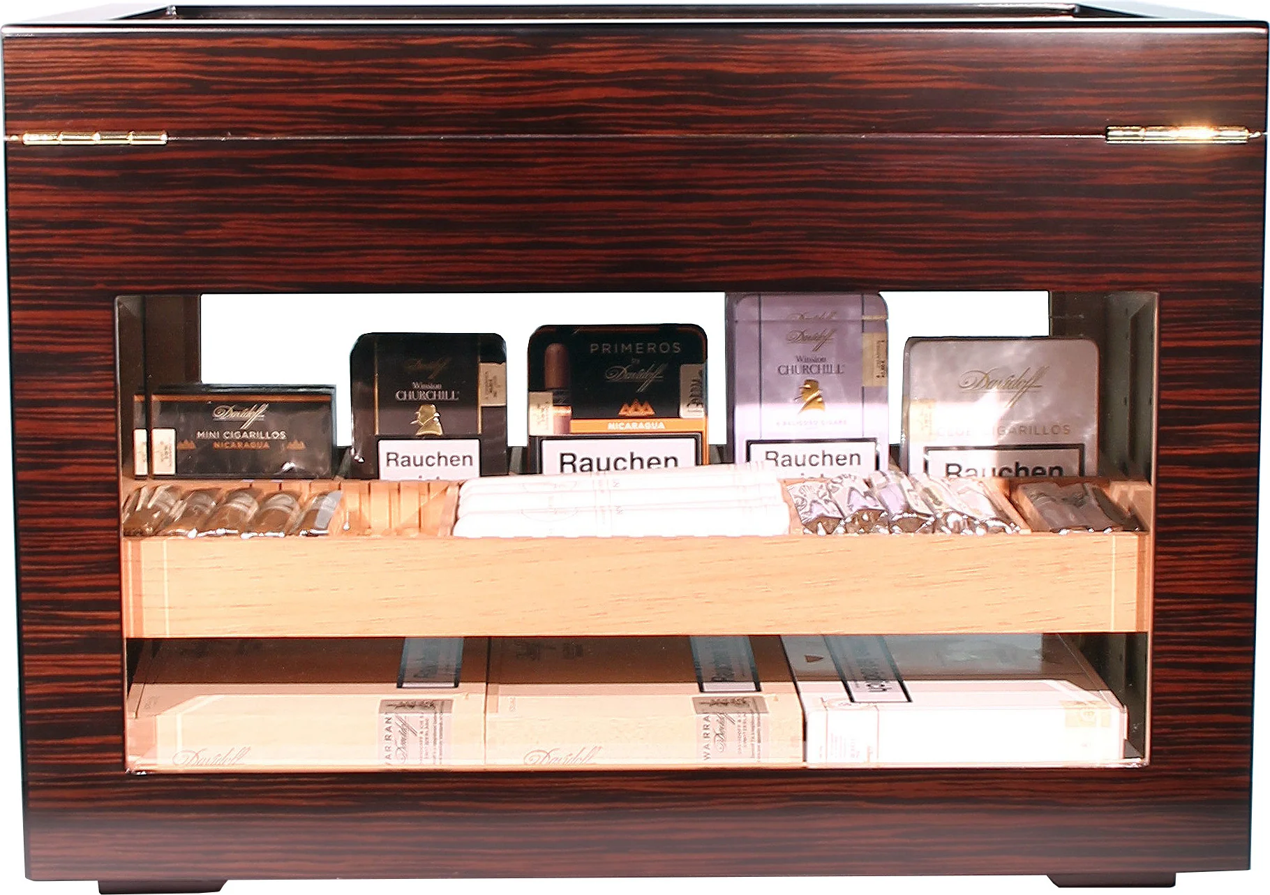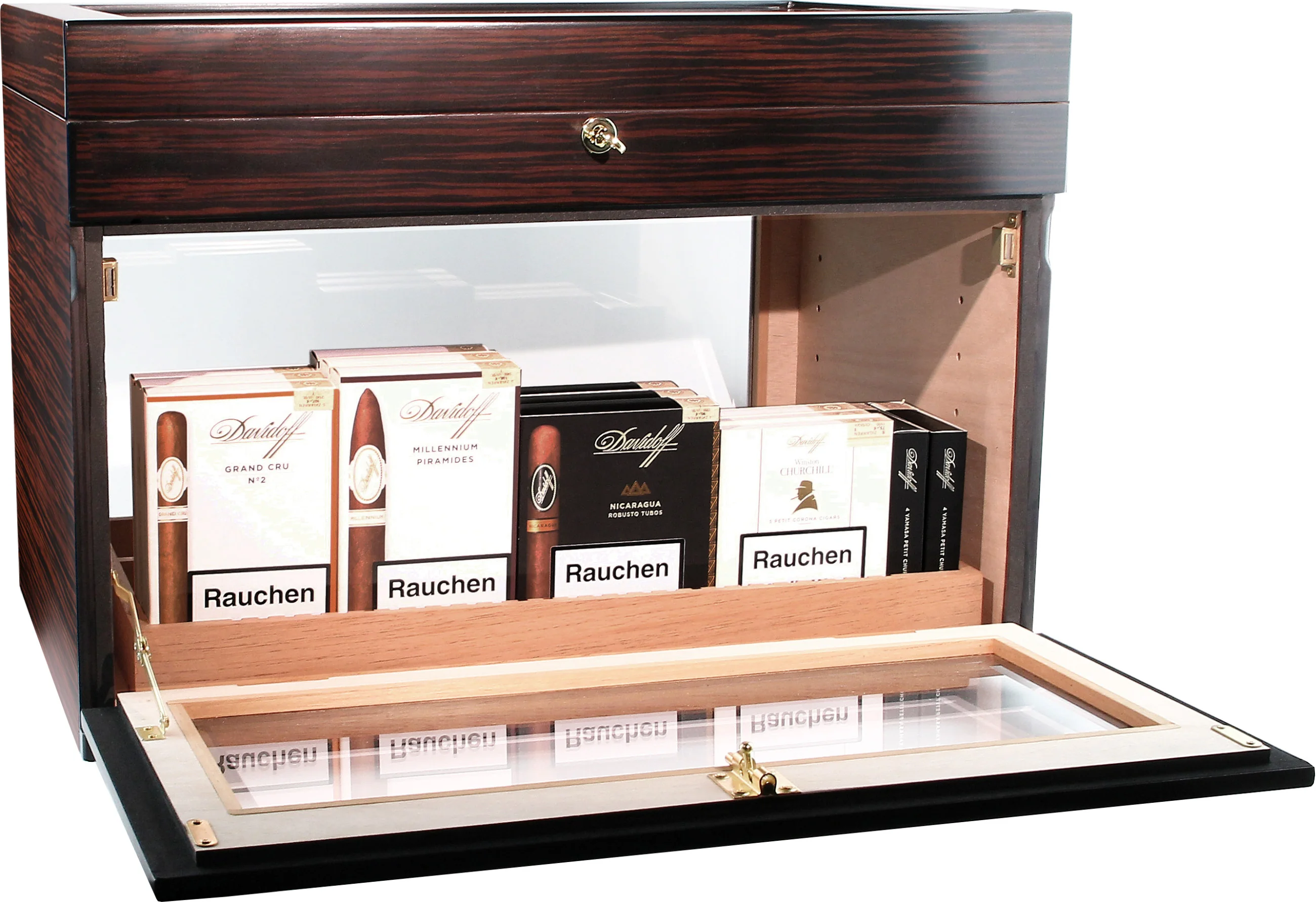 - Trays for individual cigars and boxes can be inserted and positioned at an angle for optimal presentation.