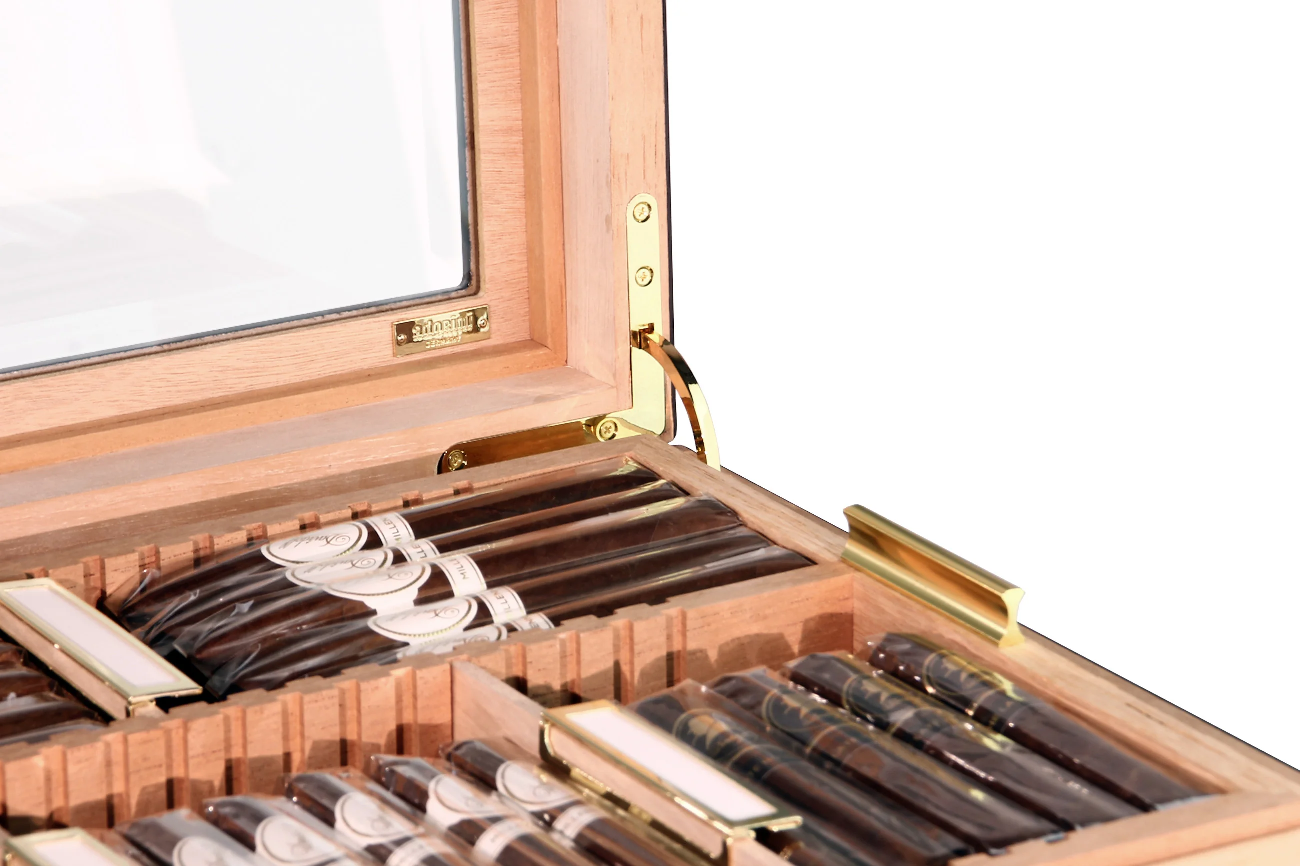 The top tray, directly below the glass lid, is fixed. It is used to store individual cigars, is removable from the top, and is ideal for serving guests or at events. Adorned with elegant gold handles, this tray makes a special impression. Both this tray and the trays below it can be flexibly divided and organized using the included dividers.