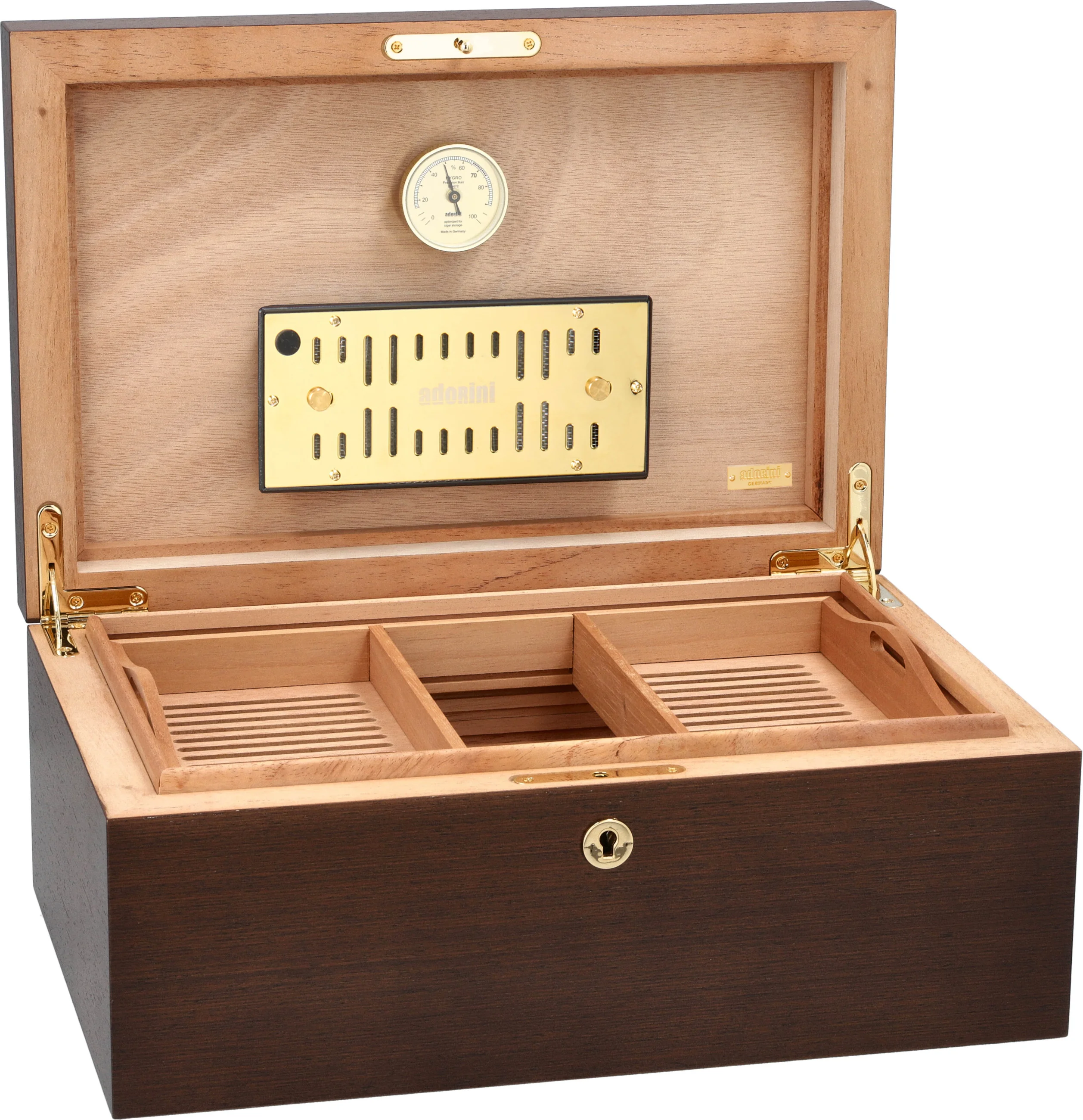 - Gold plated acryl polymer based Adorini Deluxe humidifier with adjustable ventilation openings for an optimum regulation of the humidity level