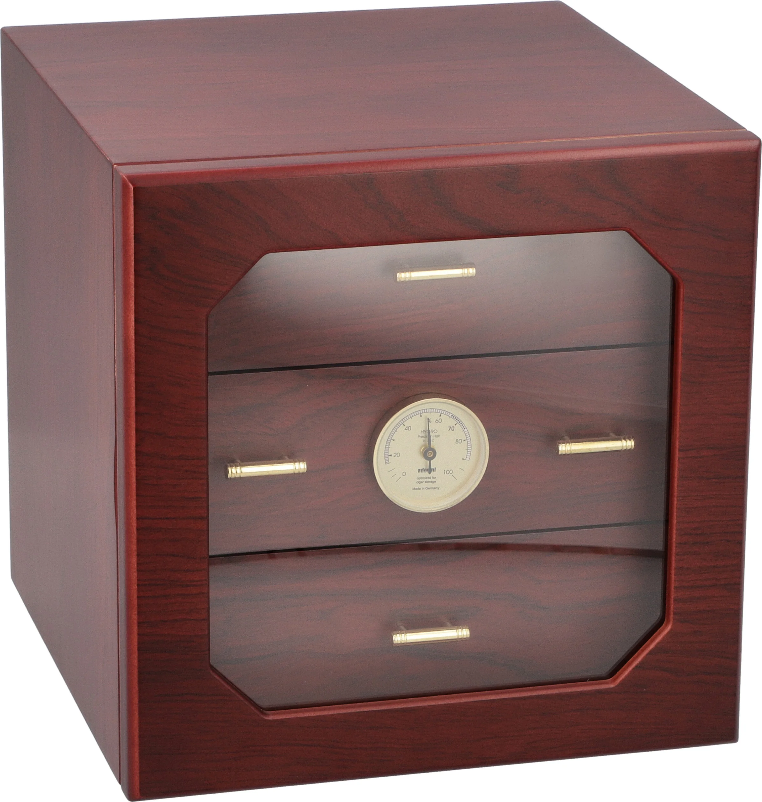 O umidificador acomoda mais de 125 charutos Corona padrão, que são mantidos em condições ideais pelo umidificador de luxo à base de polímero acrílico banhado a ouro da adorini. As aberturas de ventilação ajustáveis permitem refinar o nível de umidade para atender às especificações desejadas. Um higrômetro de cabelo de precisão pré-calibrado é montado na parte frontal da bandeja central, exigindo apenas uma rápida olhada para verificar os níveis de umidade, esteja o umidificador aberto ou fechado.
