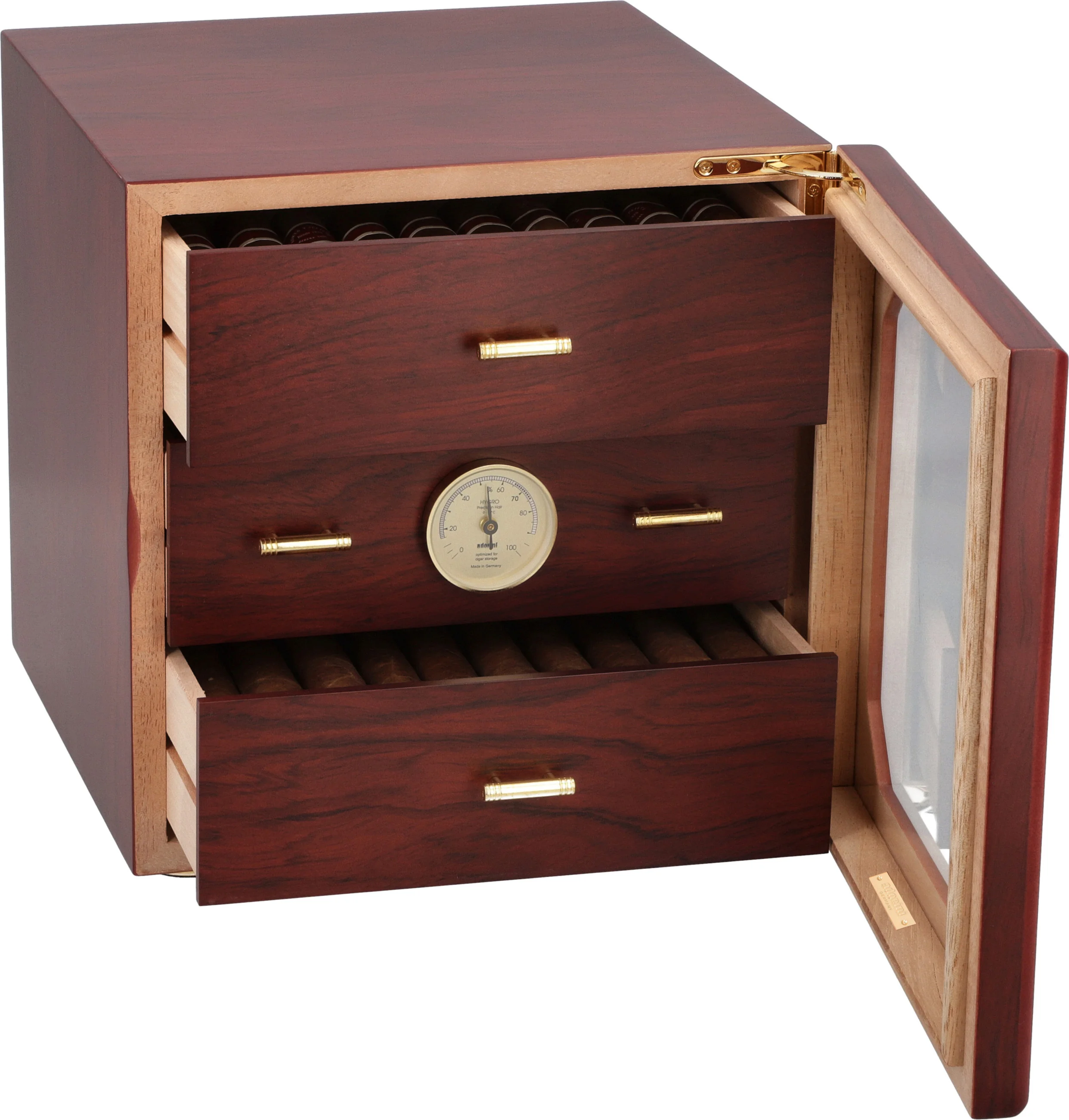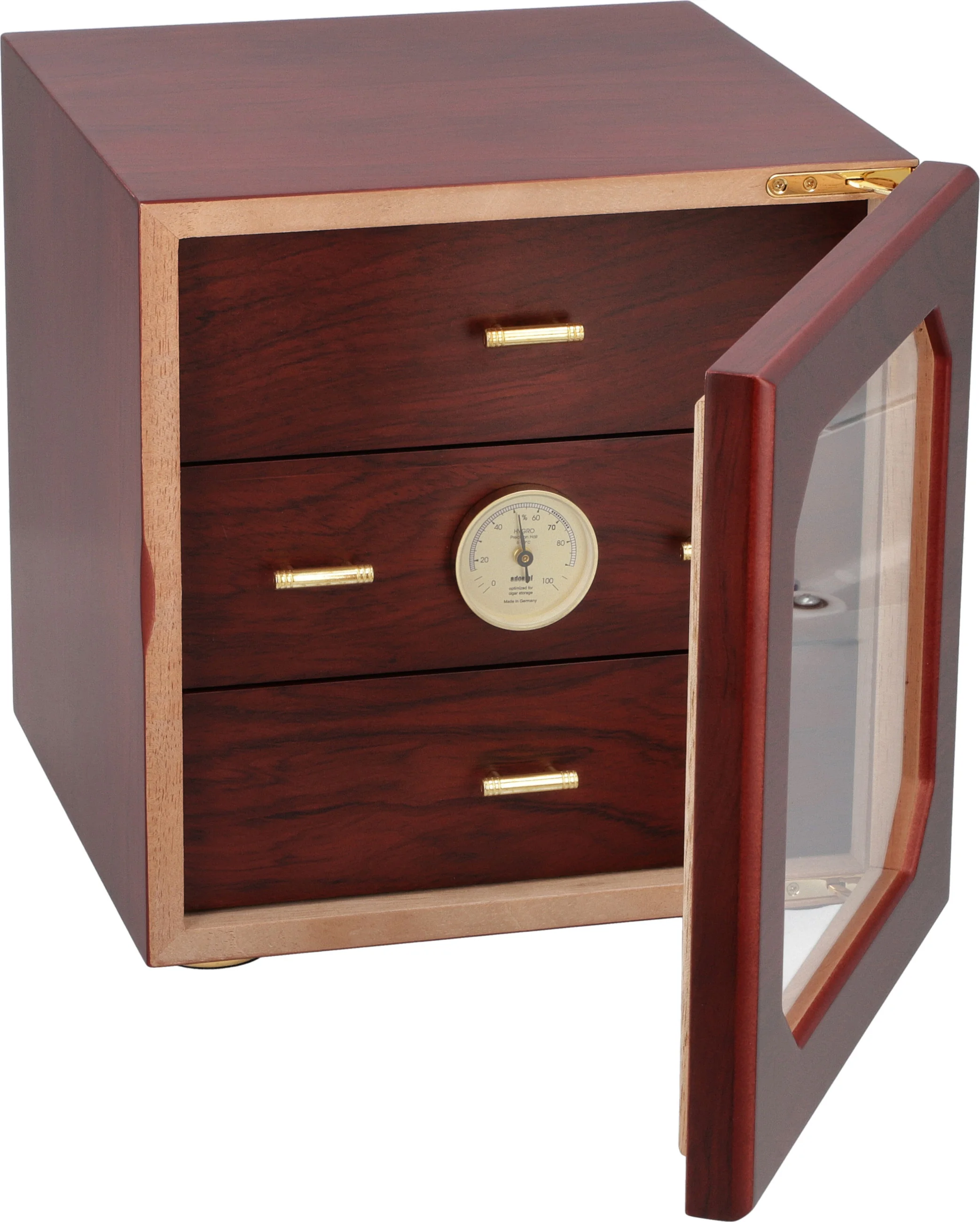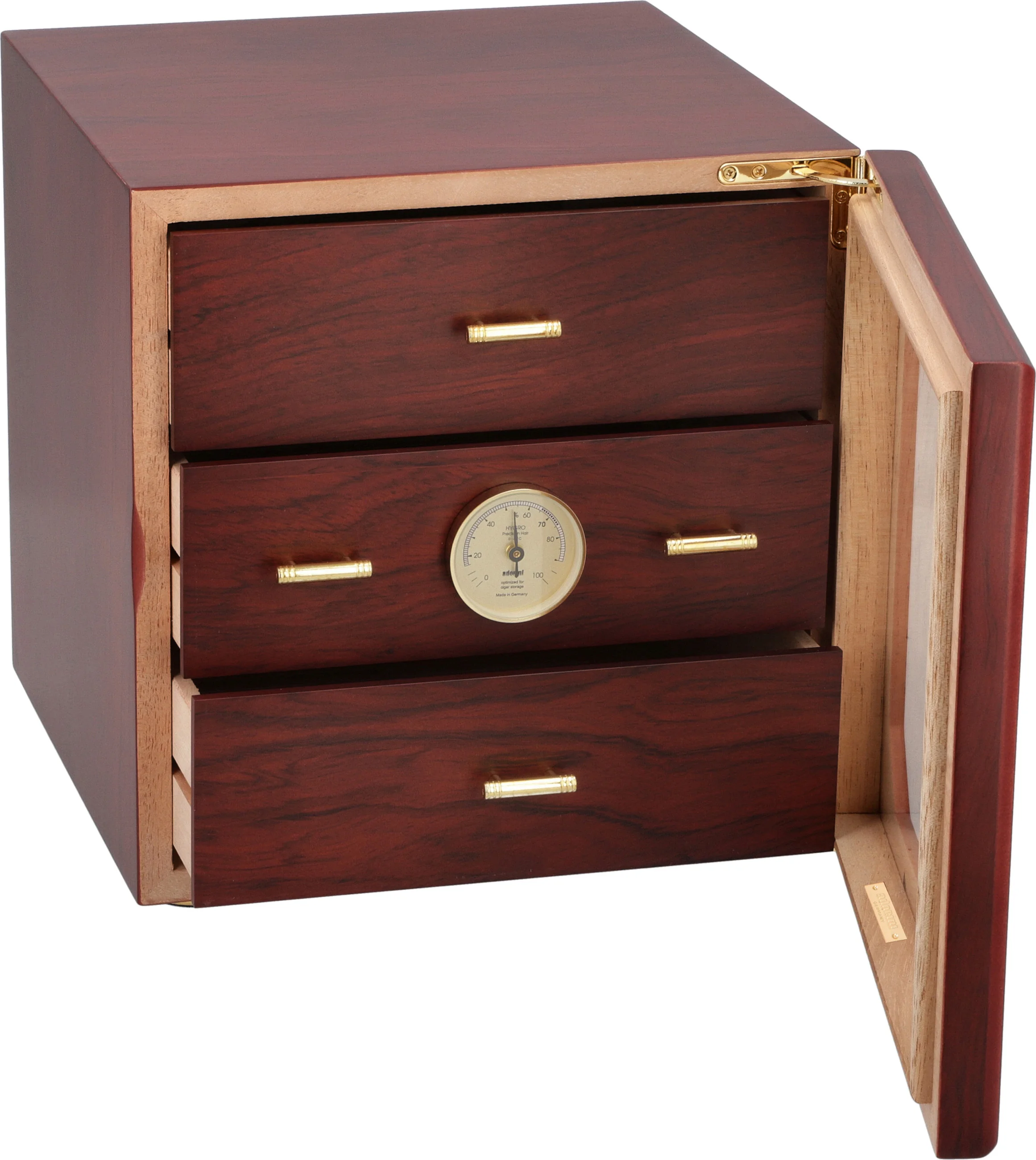 Com o design exclusivo em estilo de gabinete e tons atraentes de marrom-avermelhado escuro de um acabamento pau-rosa, o umidificador Chianti Medium Deluxe é ideal para aqueles que querem fugir de caixas excessivamente simples coloridas em um preto chato. A criação notável apresenta detalhes banhados a ouro e uma porta de abertura frontal com painel de vidro, o que o torna uma peça central atraente para qualquer sala ou escritório. O interior de cedro espanhol vaporizado apresenta três gaveta adorini, que ajudam a melhorar o fluxo de ar ao redor de seus charutos. Somando-se à flexibilidade que o umidificador oferece, há mais uma inovação da adorini, um sistema de divisórias de gavetas com clipes de etiquetas que permite separar e organizar melhor seus charutos.