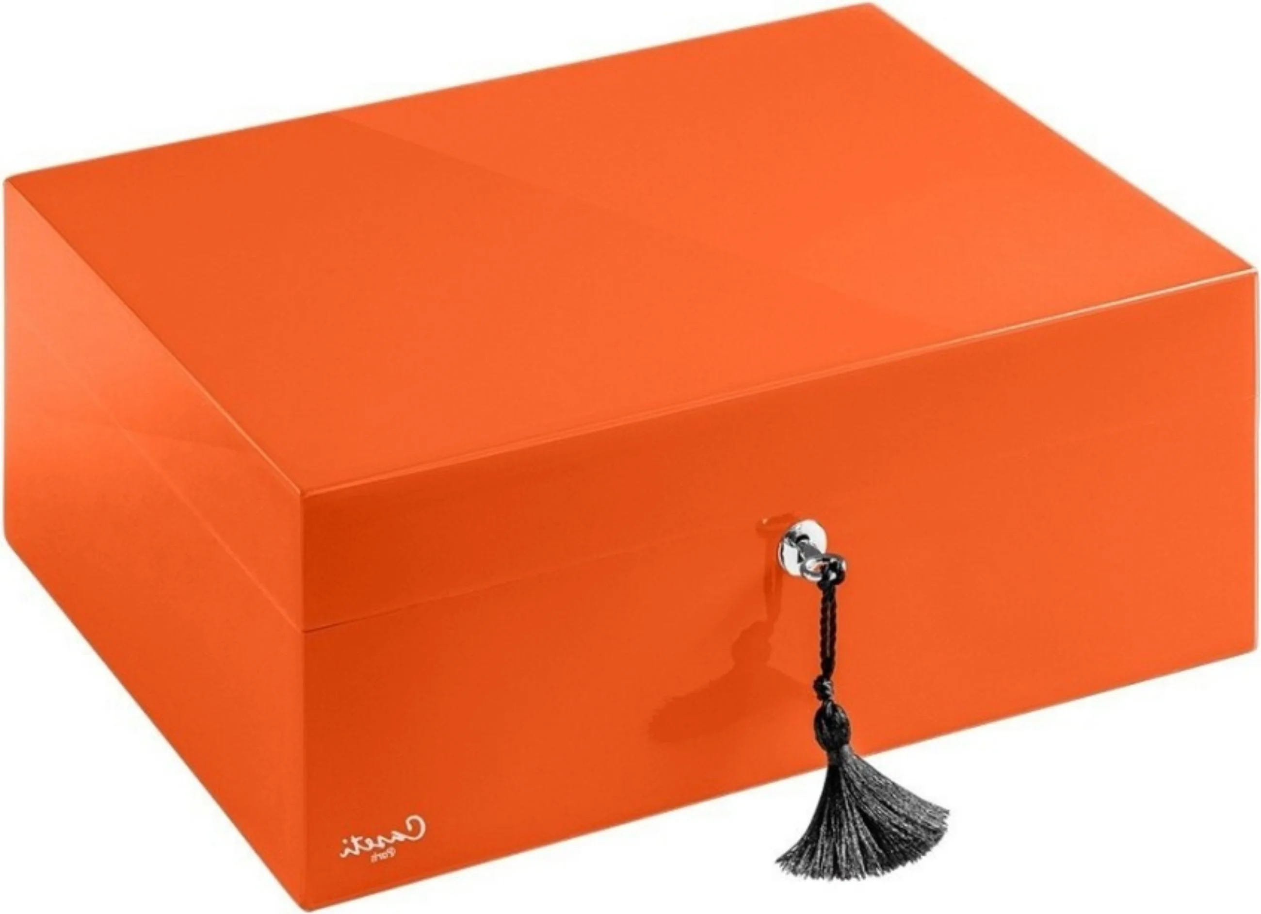 O Caseti Humidor Paris Orange é um umidor sofisticado da marca francesa Caseti que chama a atenção imediatamente com seu acabamento de alto brilho. A série Paris é sinônimo de cores vibrantes e se destaca claramente dos umidores clássicos, frequentemente vistos, de madeira folheada.
