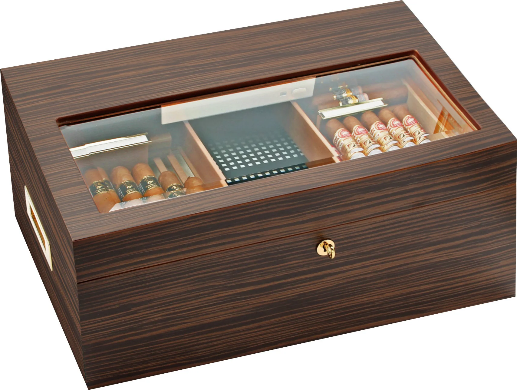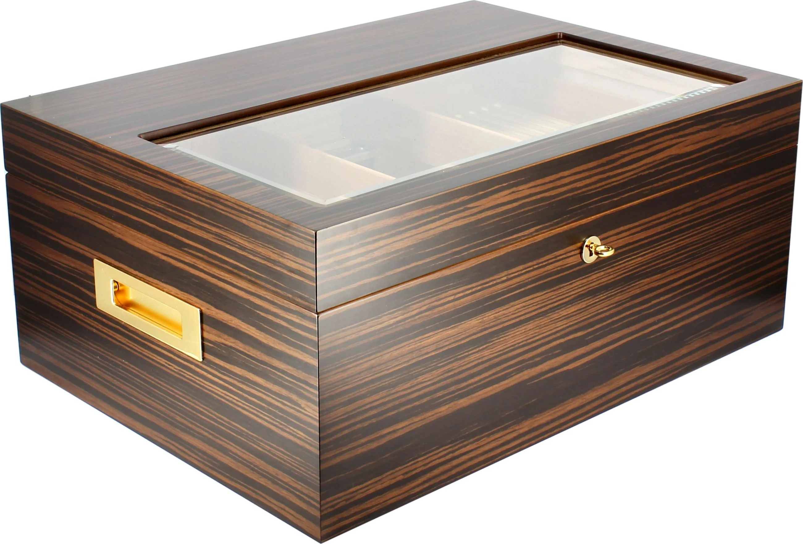 O Vittoria ganha nossa primeira escolha tanto na categoria de umidores com tampo de vidro quanto na categoria de umidores de mesa grandes. Amamos o Vittoria com sua estrutura pesada e sólida. É a rainha dos umidores de mesa. Com enorme capacidade para mais de 500 charutos, é um dos maiores umidores de mesa do mercado e já vem equipado com um potente sistema de umidificação eletrônica convenientemente localizado na tampa do umidor sem ocupar nenhum espaço de armazenamento dentro do umidor. Um verdadeiro prazer para qualquer aficionado. O Vittoria também está disponível em uma linda versão preta sem tampa de vidro.