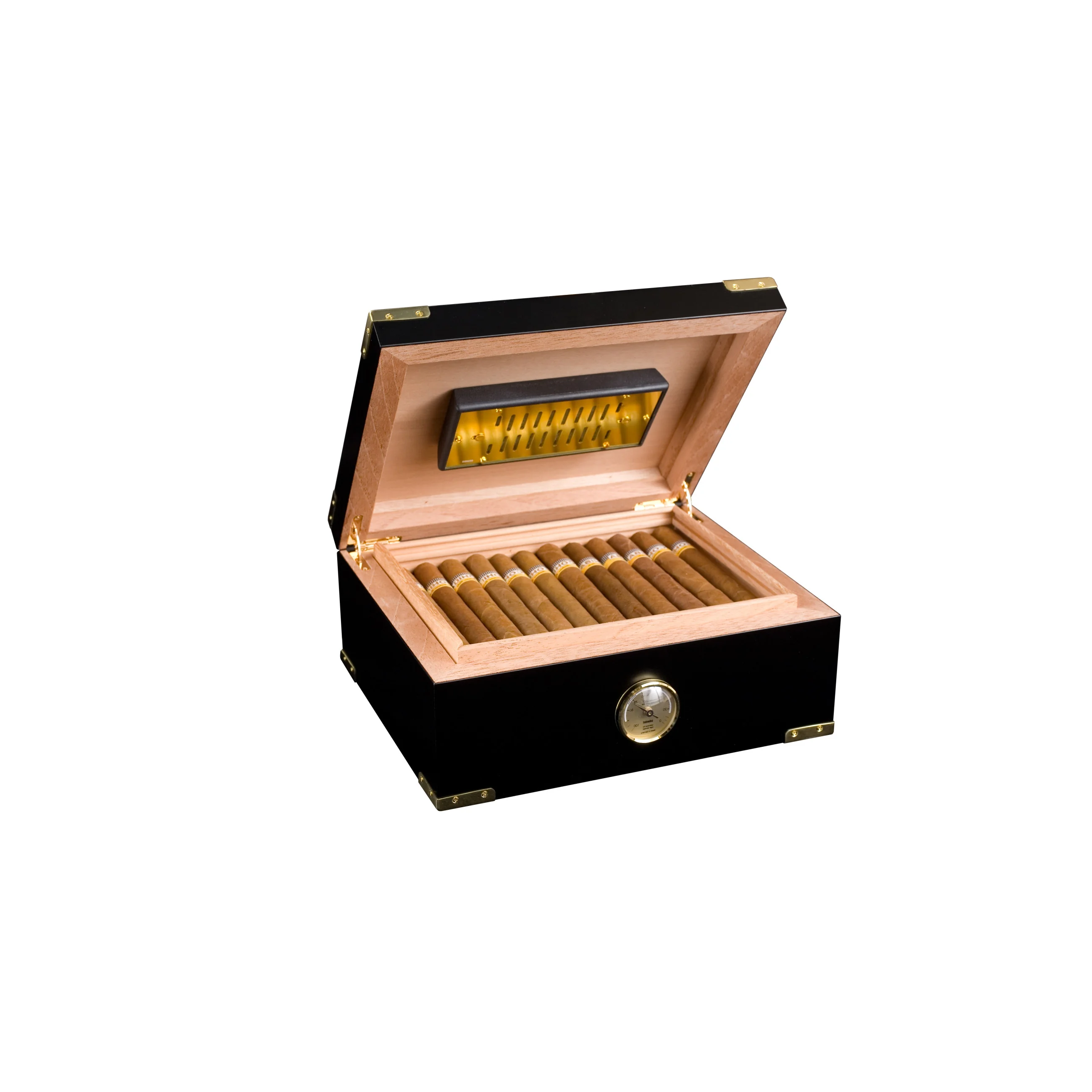 Manter a umidade adequada para até 75 charutos de tamanho Corona nunca será uma preocupação com o umidificador de luxo à base de polímero acrílico banhado a ouro da Adorini no trabalho. Esta joia bem trabalhada possui aberturas de ventilação ajustáveis para que você possa encontrar o nível de umidade perfeito para seus charutos. O umidificador é fixado na parte inferior da tampa por meio de ímãs e uma placa de metal escondida sob o folheado de cedro para otimizar ainda mais o controle de espaço e umidade.