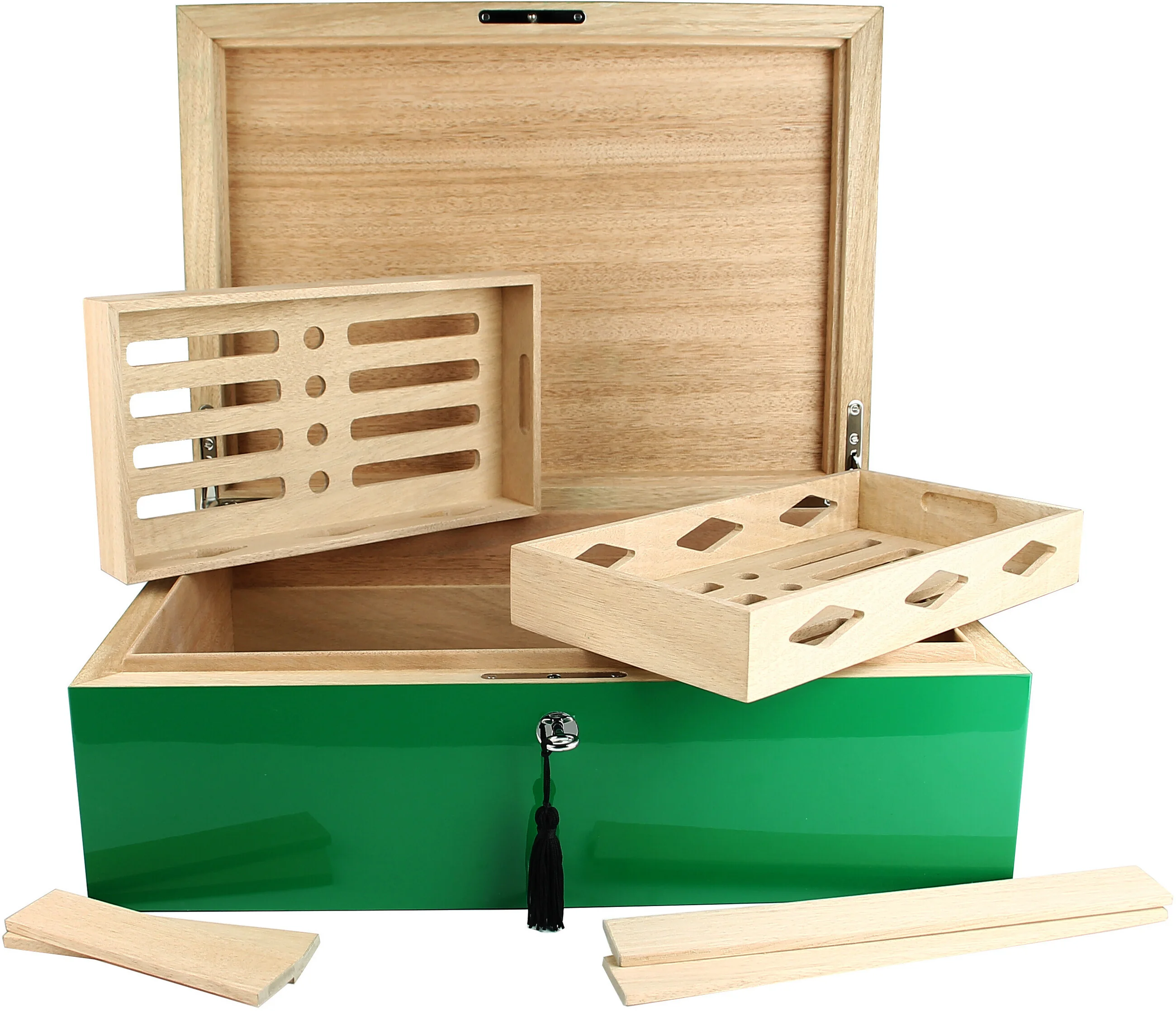 O VillaSpa Humidor Green terá o verde da multidão com inveja, com seu verde profundamente agradável acabamento em verniz (Pantone 554C). Um l conjunto de chaves proporciona paz de espírito, e conveniente alças do conjunto facilitam o manuseio do umidificador. Todas estas características se juntam para tornar o umidificador atraente e obrigatório. Capacidade máxima para 240 charutos corona.
